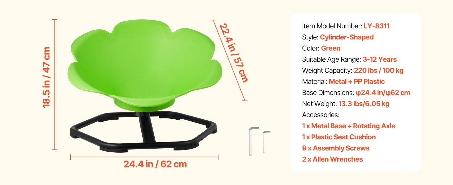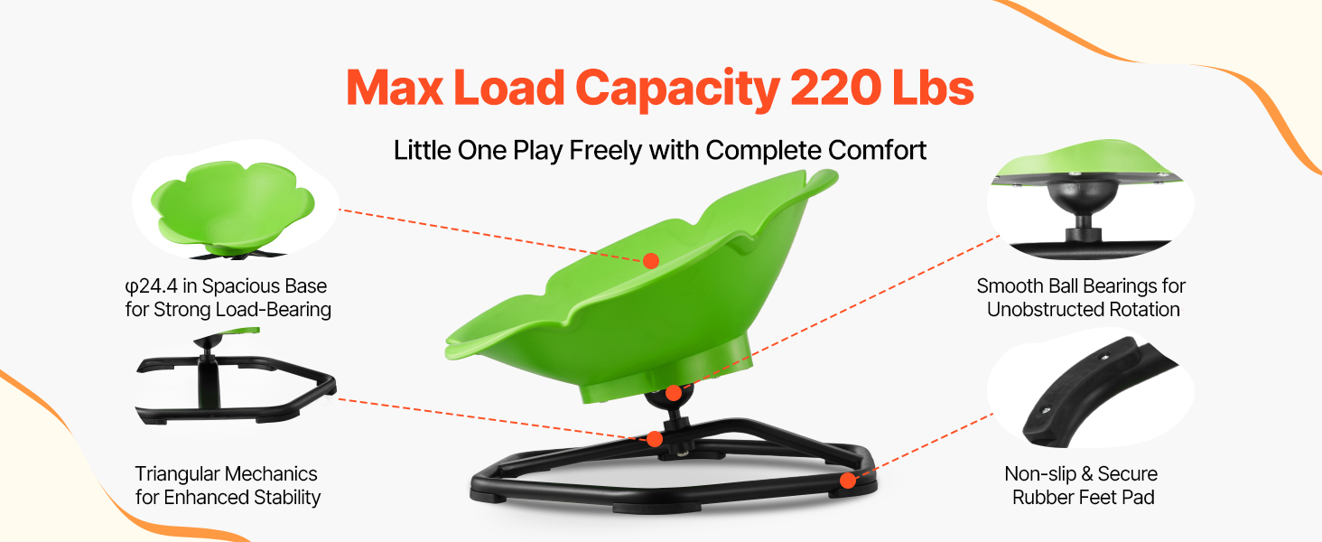 Detská rotujúca stolička s rozšírenou kovovou základňou φ 24,4/62 cm unesie až 220 libier/100 kg. Jeho trojuholníková konštrukcia s guličkovými ložiskami zaisťuje plynulé otáčanie a protišmykový dizajn zabraňuje skĺznutiu počas hry.