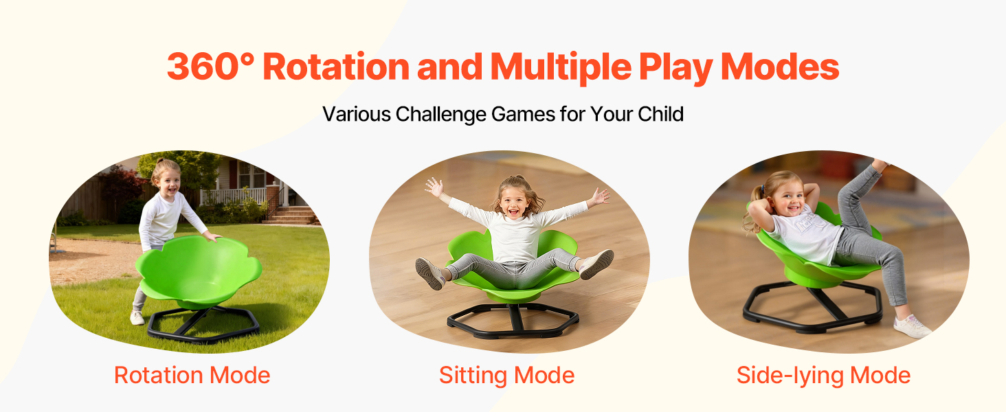Vďaka 360° otáčaniu a viacerým možnostiam hry môžu deti sedieť, ležať, otáčať sa na senzorickej otočnej stoličke a vytvárať si vlastné hry. Rodičia sa tiež môžu zapojiť do zábavnej interaktívnej hry, čo z nej robí skvelú rodinnú hračku.