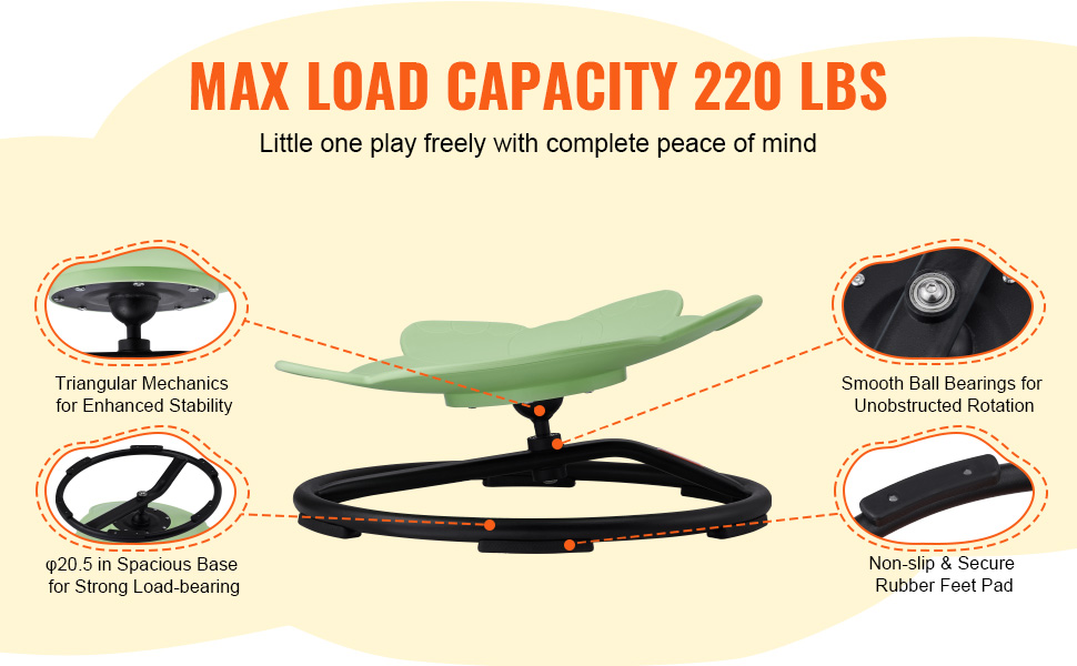 Detská rotujúca stolička s rozšírenou 20,5-palcovou kovovou základňou unesie až 220 kg. Jej trojuholníková konštrukcia s guličkovými ložiskami zabezpečuje plynulé otáčanie a protišmykový dizajn zabraňuje posúvaniu počas hry.