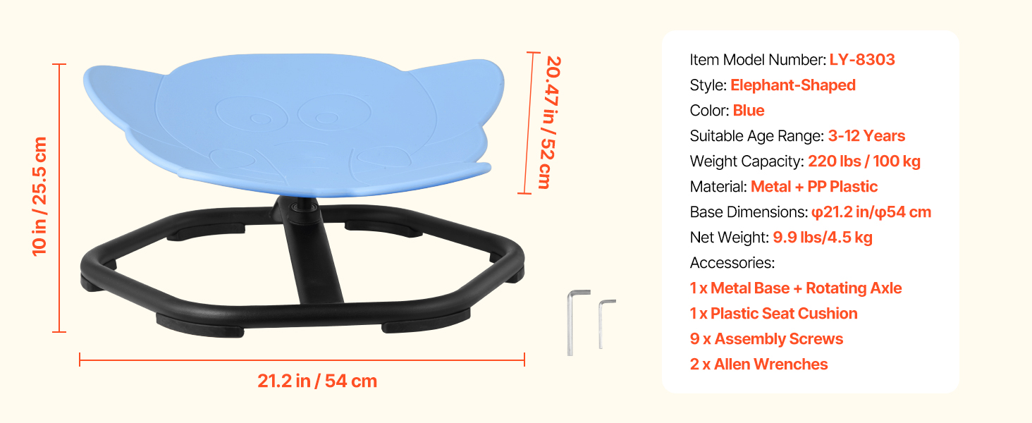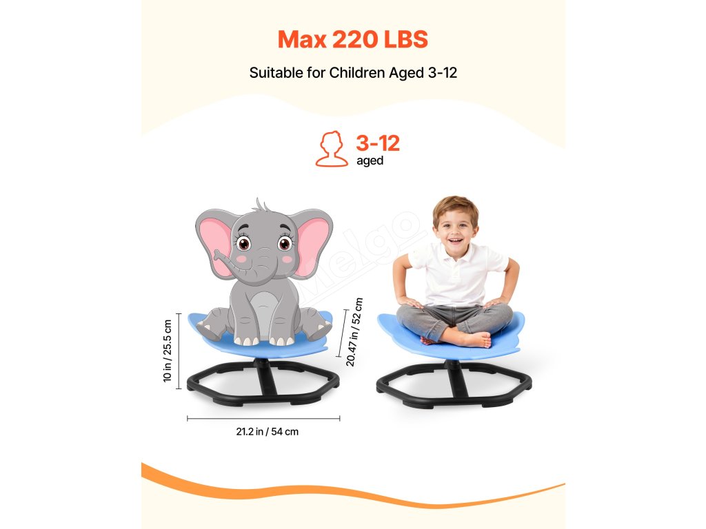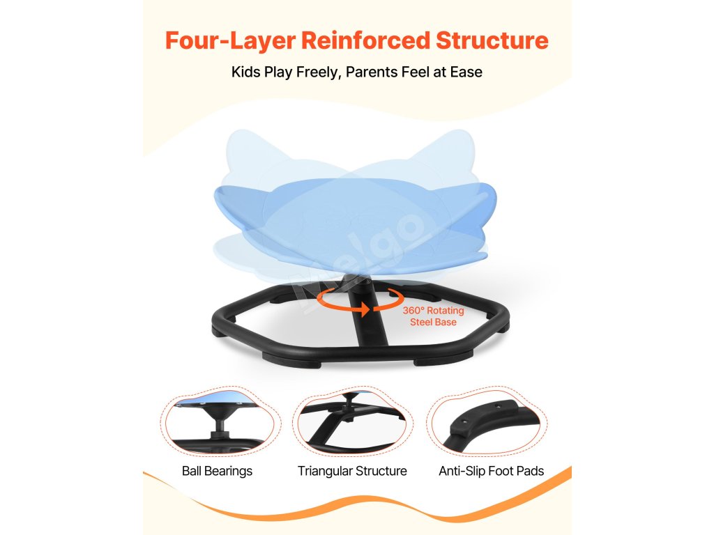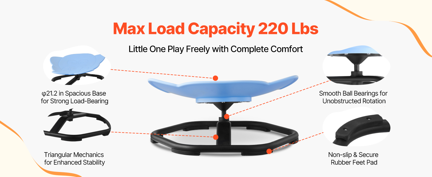 Detská rotujúca stolička s rozšírenou kovovou základňou 21,2 palca/54 cm unesie až 220 libier/100 kg. Jeho trojuholníková konštrukcia s guličkovými ložiskami zabezpečuje plynulé otáčanie a protišmyková konštrukcia zabraňuje skĺznutiu počas hry.