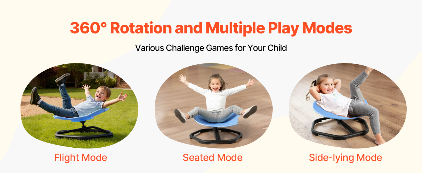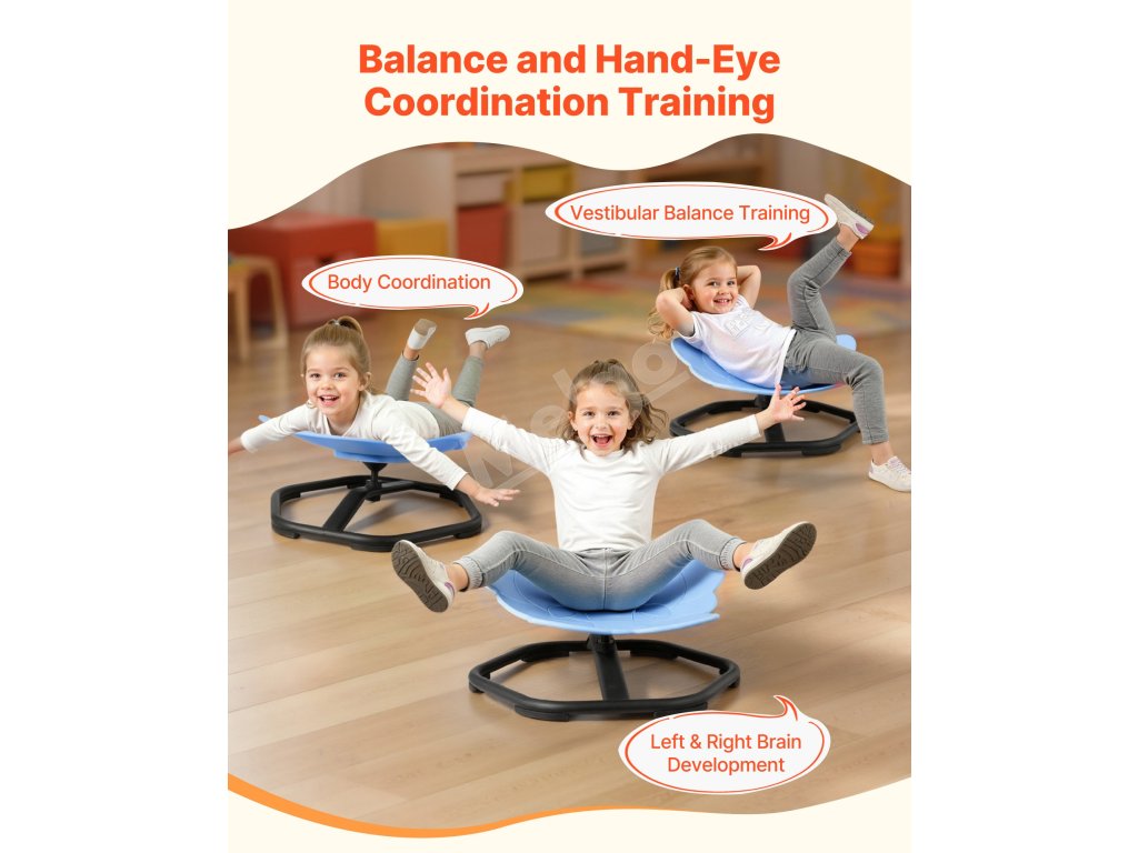 Vďaka 360° otáčaniu a viacerým možnostiam hry môžu deti sedieť, ležať, otáčať sa na senzorickej otočnej stoličke a vytvárať si vlastné hry. Rodičia sa tiež môžu zapojiť do zábavnej interaktívnej hry, čo z nej robí skvelú rodinnú hračku.