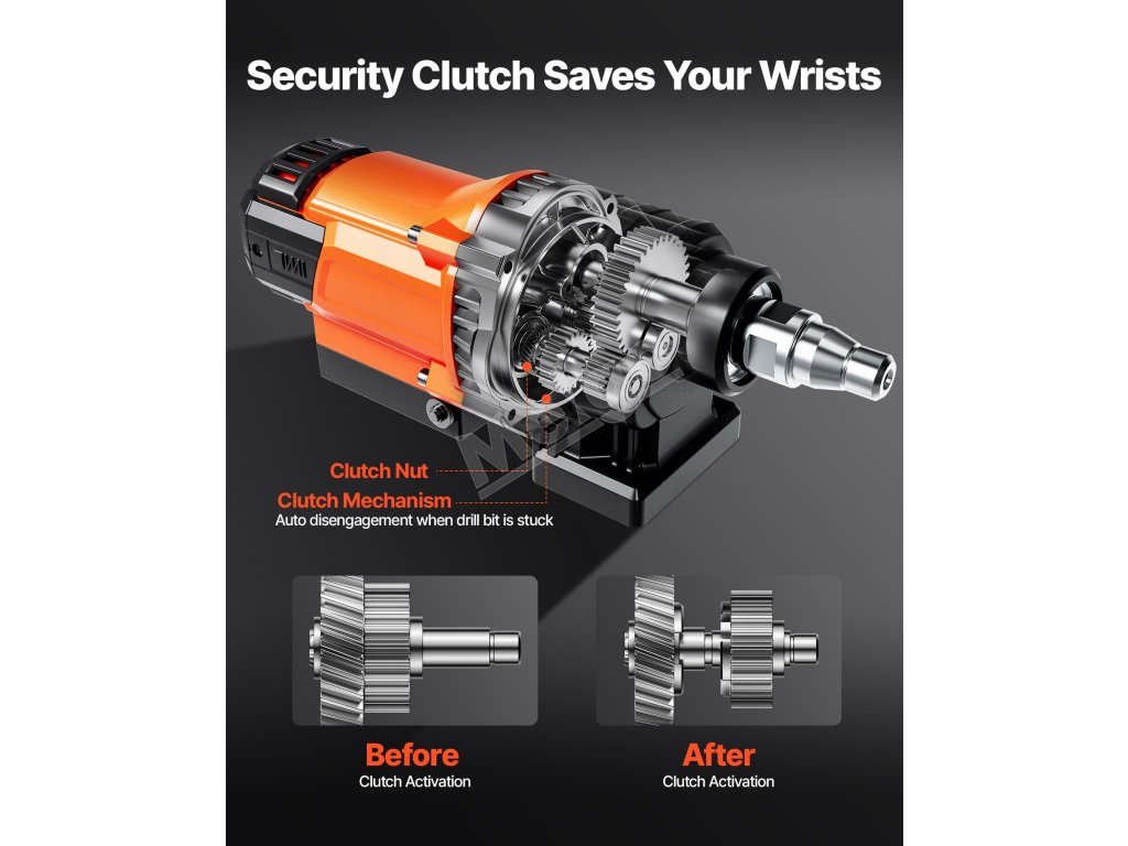 Zostaňte chránení počas práce. Zabudovaná bezpečnostná spojka jadrovej vŕtačky sa automaticky vypne, keď sa vrták zasekne, čím znižuje spätný ráz a pomáha predchádzať poraneniam zápästia.