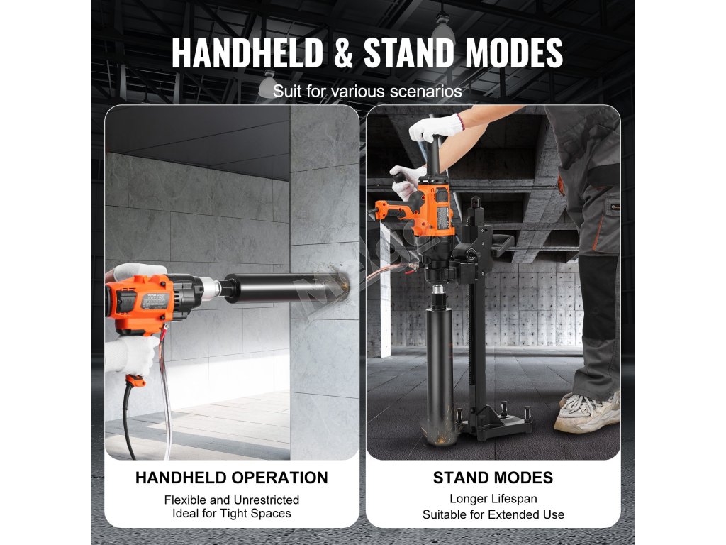 Naša jadrová vŕtačka ponúka režimy ručnej a stojanovej vŕtačky, ktoré vyhovujú vašej úlohe. Ručný režim je ideálny na flexibilnú prevádzku a presné ovládanie, zatiaľ čo režim montáže na stojan poskytuje zvýšenú stabilitu, vďaka čomu je ideálny na rozsiahle alebo rozsiahlejšie projekty a znižuje únavu obsluhy.