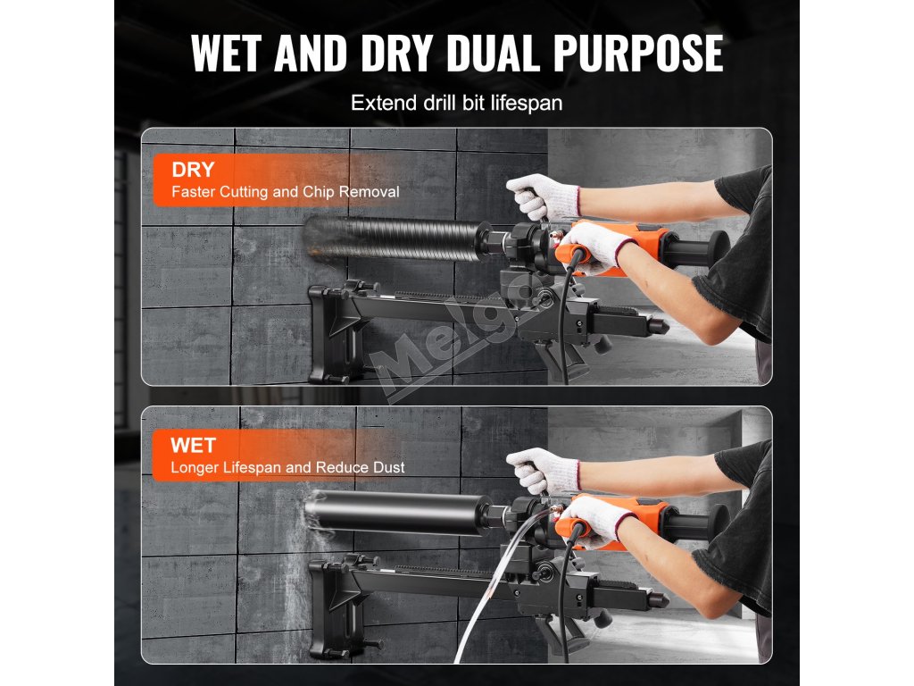 Vyskúšajte si vynikajúcu rýchlosť rezania a odstraňovania nečistôt s režimom suchého rezania. Režim mokrého rezania znižuje prašnosť a prehrievanie počas prevádzky, čím zvyšuje bezpečnosť a komfort v pracovnom prostredí. Pomáha tiež znižovať opotrebovanie nástrojov, čím predlžuje životnosť jadrového vŕtacieho stroja.