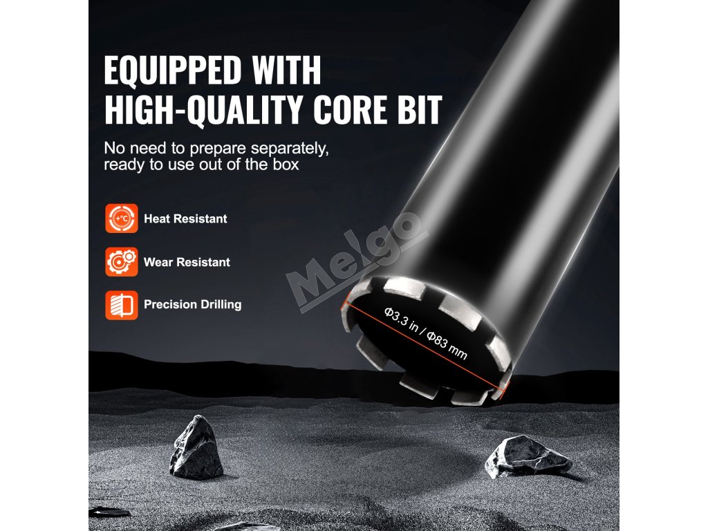 Táto jadrová vŕtačka do betónu, vybavená vrtákom s veľkým priemerom Φ3,3" / Φ83 mm, vyniká pri rozsiahlych projektoch alebo špecializovaných aplikáciách. Či už ide o stavebné práce, renováciu alebo úlohy pre domácich majstrov, táto vŕtačka zaručí, že každý otvor bude presný a precízny.
