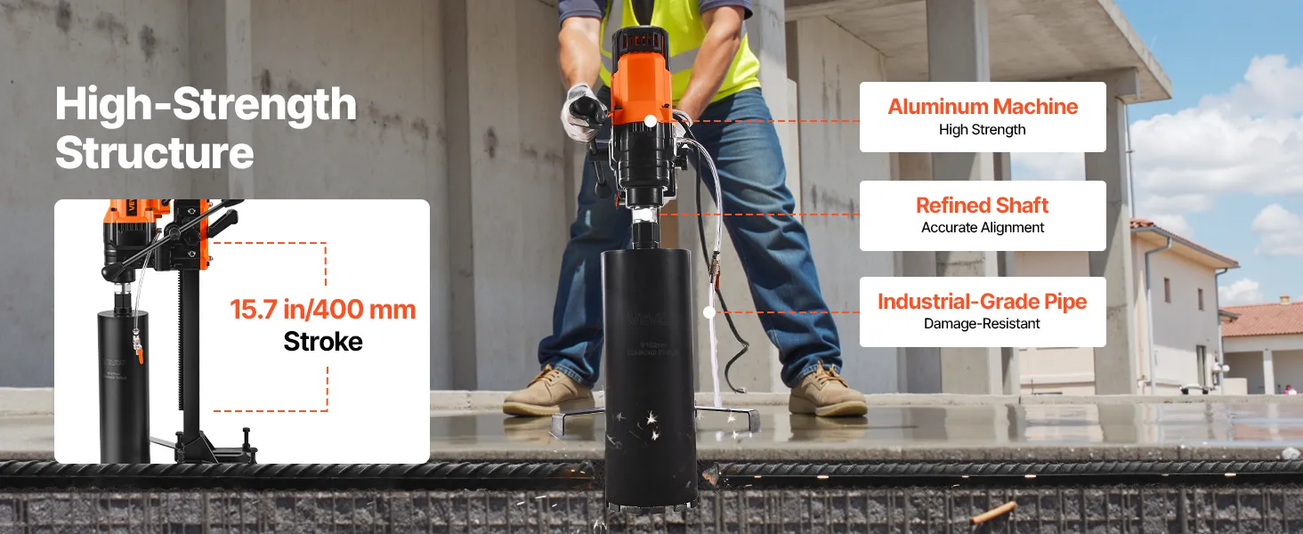 Táto jadrová vŕtačka má výkonný 3000W motor, ktorý dosahuje až 850 otáčok za minútu na rýchle a efektívne vŕtanie. Vďaka maximálnemu priemeru vŕtania 8 palcov (200 mm) je pripravená ľahko zvládnuť rozsiahle práce.