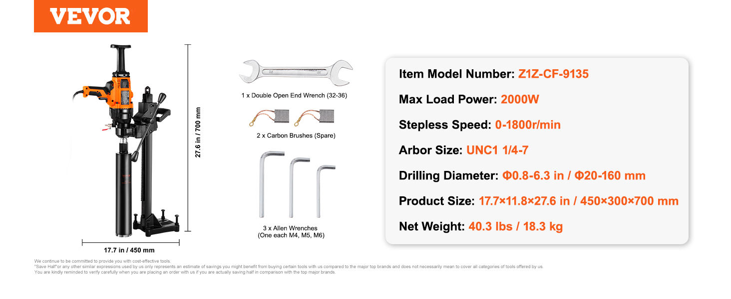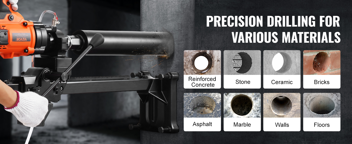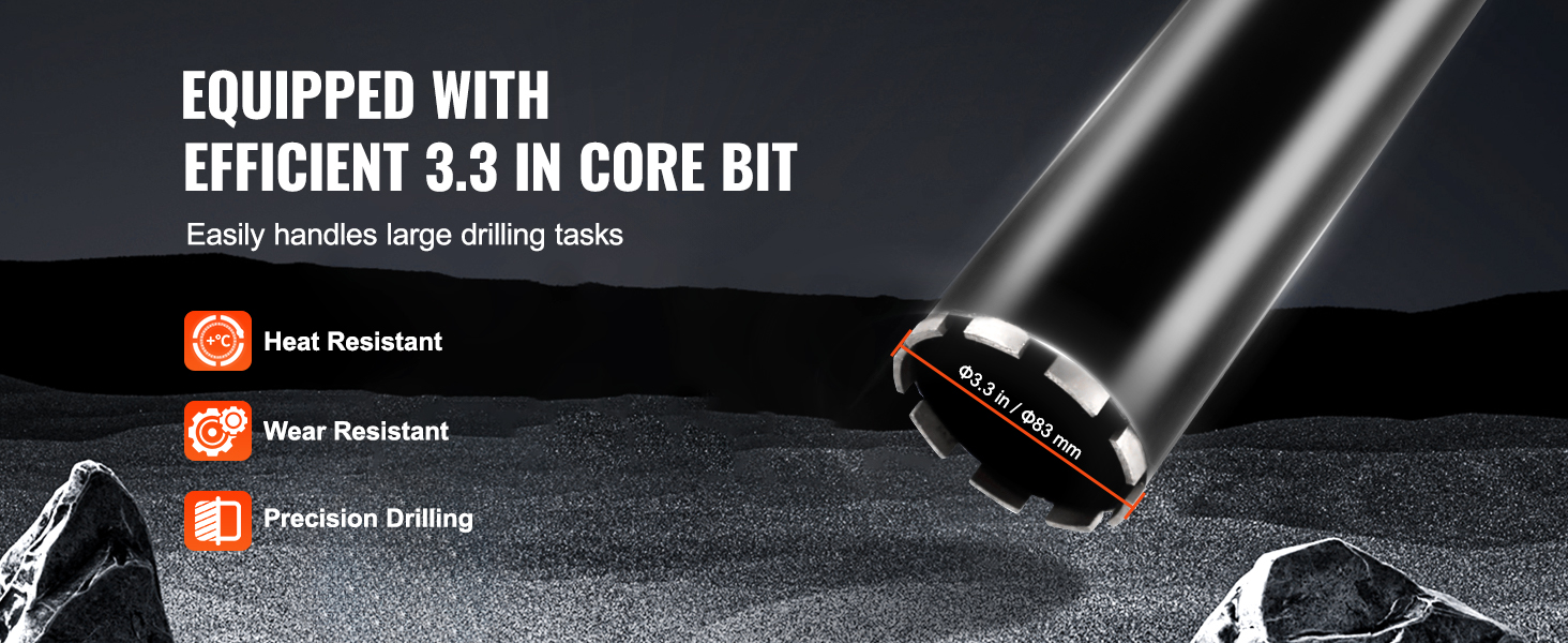 Táto jadrová vŕtačka do betónu, vybavená vrtákom s veľkým priemerom Φ3,3" / Φ83 mm, vyniká pri rozsiahlych projektoch alebo špecializovaných aplikáciách. Či už ide o stavebné práce, renováciu alebo úlohy pre domácich majstrov, táto vŕtačka zaručí, že každý otvor bude presný a precízny.