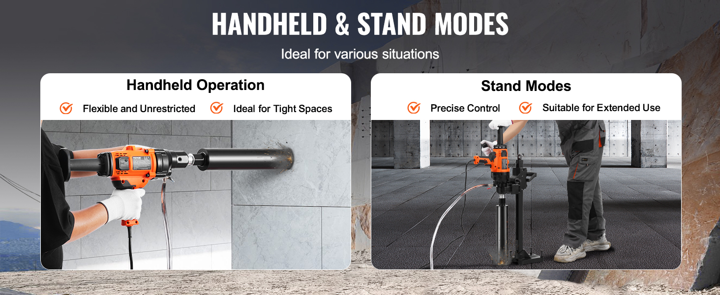 Naša jadrová vŕtačka je vybavená ručným a stojanovým režimom, aby vyhovovala vašej úlohe. Ručný režim je ideálny na flexibilnú prevádzku a presné ovládanie, zatiaľ čo režim montáže na stojan poskytuje zvýšenú stabilitu, vďaka čomu je ideálny na rozsiahle alebo rozsiahlejšie projekty a znižuje únavu obsluhy.