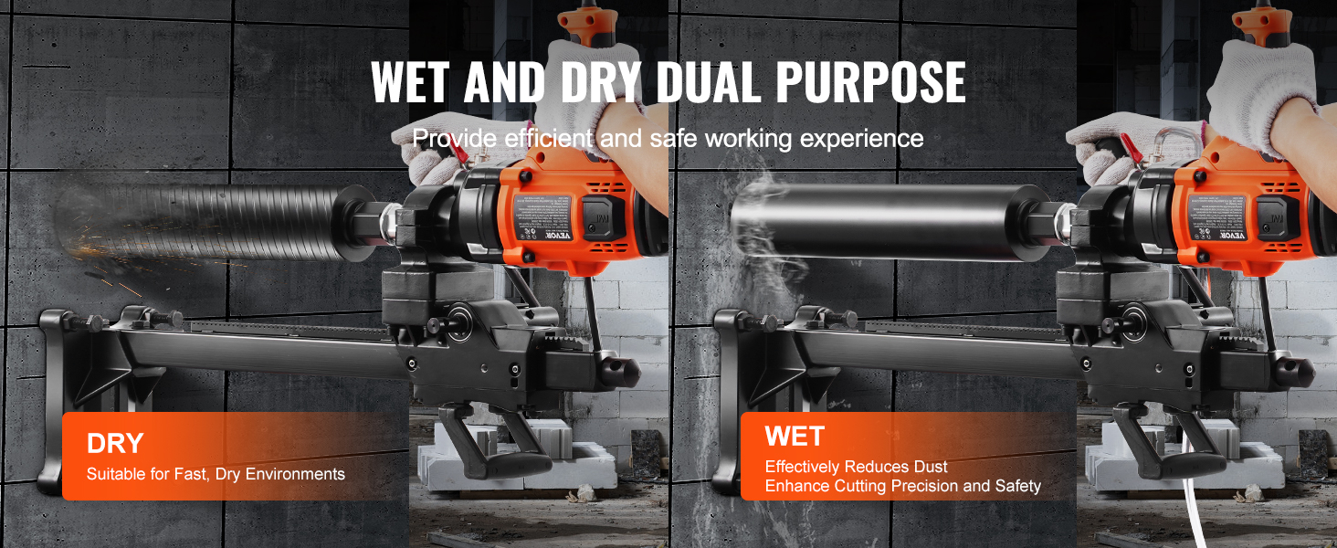 Vyskúšajte si vynikajúcu rýchlosť rezania a odstraňovania nečistôt s režimom suchého rezania. Režim mokrého rezania znižuje prašnosť a prehrievanie počas prevádzky, čím zvyšuje bezpečnosť a komfort v pracovnom prostredí. Pomáha tiež znižovať opotrebovanie nástrojov, čím predlžuje životnosť jadrového vŕtacieho stroja.