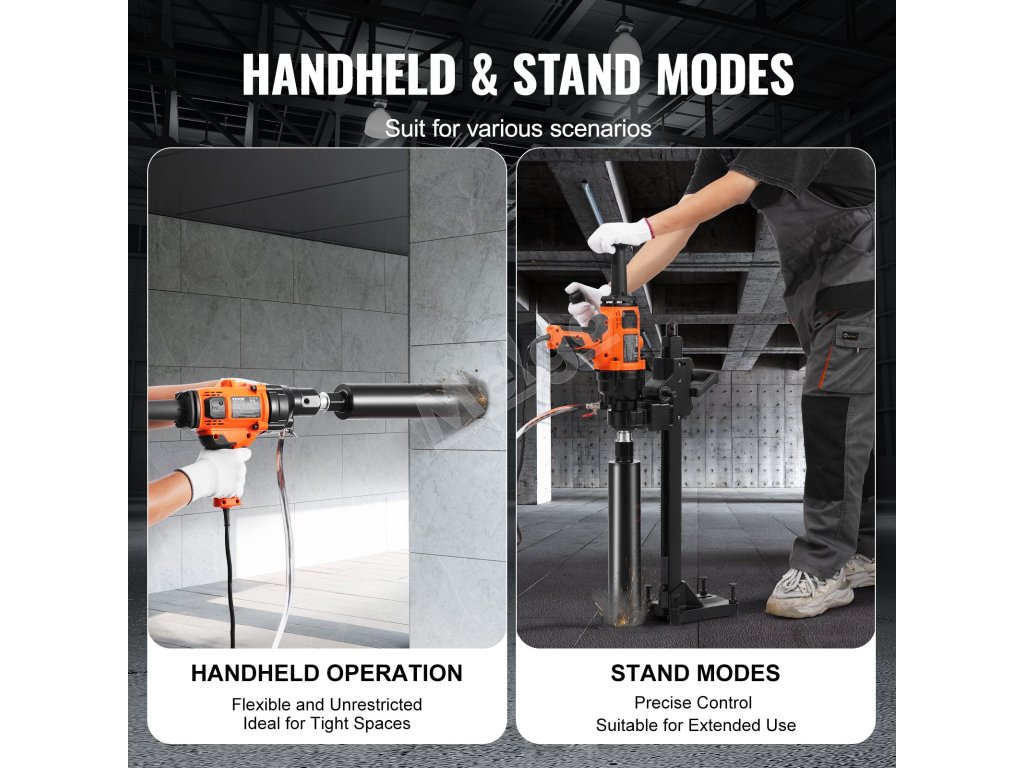 Naša jadrová vŕtačka je vybavená ručným a stojanovým režimom, aby vyhovovala vašej úlohe. Ručný režim je ideálny na flexibilnú prevádzku a presné ovládanie, zatiaľ čo režim montáže na stojan poskytuje zvýšenú stabilitu, vďaka čomu je ideálny na rozsiahle alebo rozsiahlejšie projekty a znižuje únavu obsluhy.