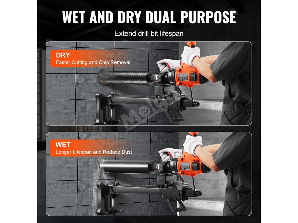 Vyskúšajte si vynikajúcu rýchlosť rezania a odstraňovania nečistôt s režimom suchého rezania. Režim mokrého rezania znižuje prašnosť a prehrievanie počas prevádzky, čím zvyšuje bezpečnosť a komfort v pracovnom prostredí. Pomáha tiež znižovať opotrebovanie nástrojov, čím predlžuje životnosť jadrového vŕtacieho stroja.