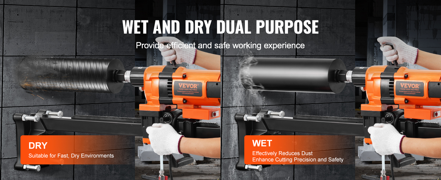 Vyskúšajte vynikajúcu rýchlosť rezania a odstraňovania úlomkov vďaka režimu suchého rezania. Režim mokrého rezania znižuje prašnosť a prehrievanie počas prevádzky, čím zvyšuje bezpečnosť a komfort v pracovnom prostredí. Pomáha tiež znižovať opotrebovanie nástrojov, čím predlžuje životnosť jadrového vŕtacieho stroja.
