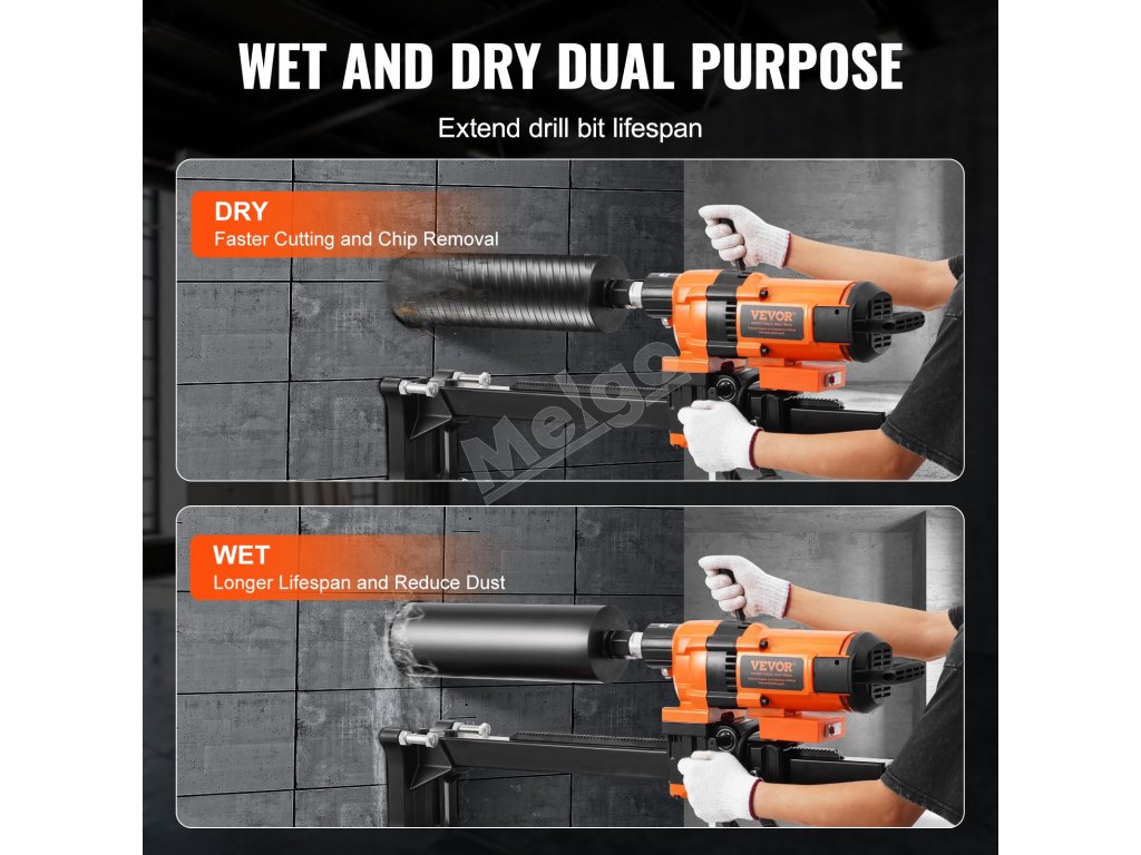 Vyskúšajte vynikajúcu rýchlosť rezania a odstraňovania úlomkov vďaka režimu suchého rezania. Režim mokrého rezania znižuje prašnosť a prehrievanie počas prevádzky, čím zvyšuje bezpečnosť a komfort v pracovnom prostredí. Pomáha tiež znižovať opotrebovanie nástrojov, čím predlžuje životnosť jadrového vŕtacieho stroja.