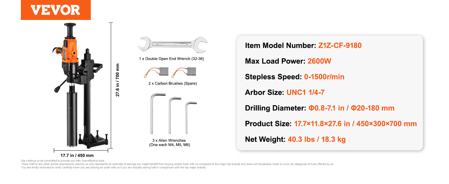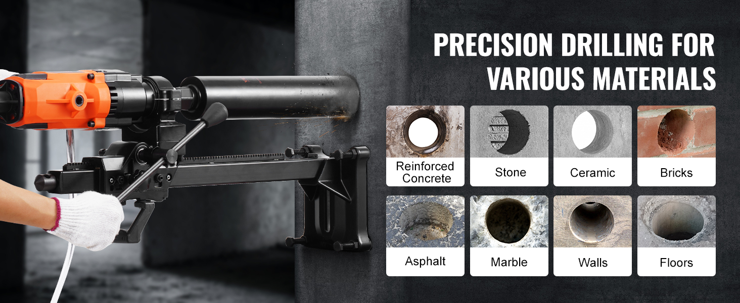 Táto jadrová vŕtačka do betónu, vybavená vrtákom s veľkým priemerom Φ3,3" / Φ83 mm, vyniká pri rozsiahlych projektoch alebo špecializovaných aplikáciách. Či už ide o stavebné práce, renováciu alebo úlohy pre domácich majstrov, táto vŕtačka zaručí, že každý otvor bude presný a precízny.