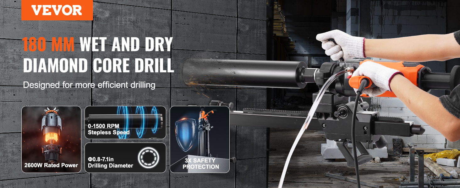 Motor jadrovej vŕtačky s výkonom 2600 W poskytuje dostatočný výkon na prácu s náročnými materiálmi, vďaka čomu je proces vŕtania rýchlejší a stabilnejší. Nastaviteľné otáčky umožňujú jemné doladenie rýchlosti podľa rôznych materiálov a požiadaviek projektu, čím sa zabezpečí presná kontrola.