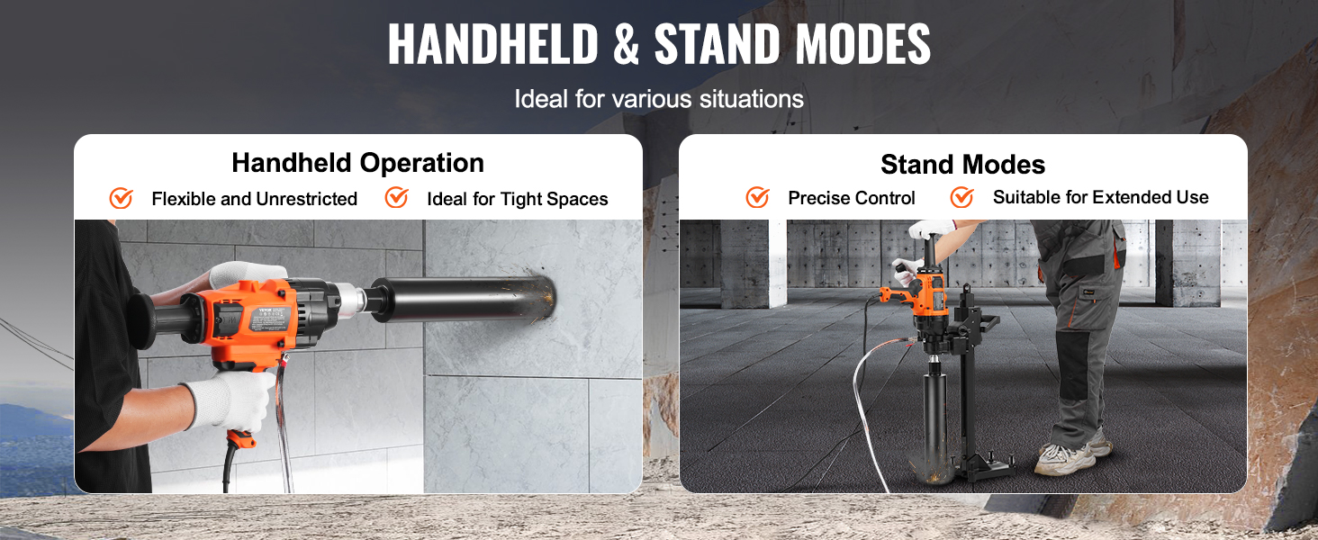 Naša jadrová vŕtačka ponúka režimy ručnej a stojanovej vŕtačky, ktoré vyhovujú vašej úlohe. Ručný režim je ideálny na flexibilnú prevádzku a presné ovládanie, zatiaľ čo režim montáže na stojan poskytuje zvýšenú stabilitu, vďaka čomu je ideálny na rozsiahle alebo rozsiahlejšie projekty a znižuje únavu obsluhy.