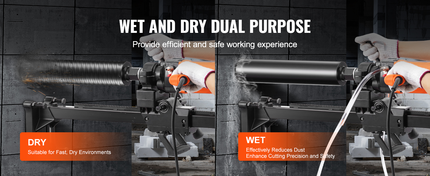 Vyskúšajte si vynikajúcu rýchlosť rezania a odstraňovania nečistôt s režimom suchého rezania. Režim mokrého rezania znižuje prašnosť a prehrievanie počas prevádzky, čím zvyšuje bezpečnosť a komfort v pracovnom prostredí. Pomáha tiež znižovať opotrebovanie nástrojov, čím predlžuje životnosť jadrového vŕtacieho stroja.