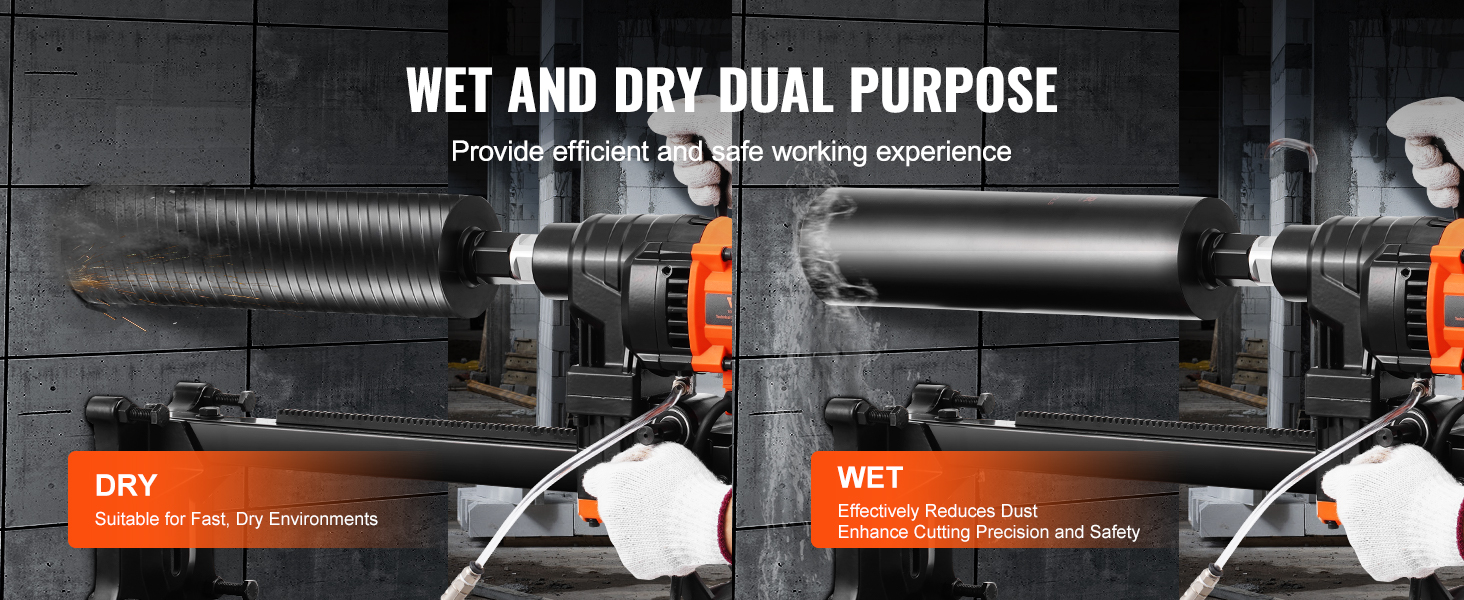 Vyskúšajte vynikajúcu rýchlosť rezania a odstraňovania úlomkov vďaka režimu suchého rezania. Režim mokrého rezania znižuje prašnosť a prehrievanie počas prevádzky, čím zvyšuje bezpečnosť a komfort v pracovnom prostredí. Pomáha tiež znižovať opotrebovanie nástrojov, čím predlžuje životnosť jadrového vŕtacieho stroja.