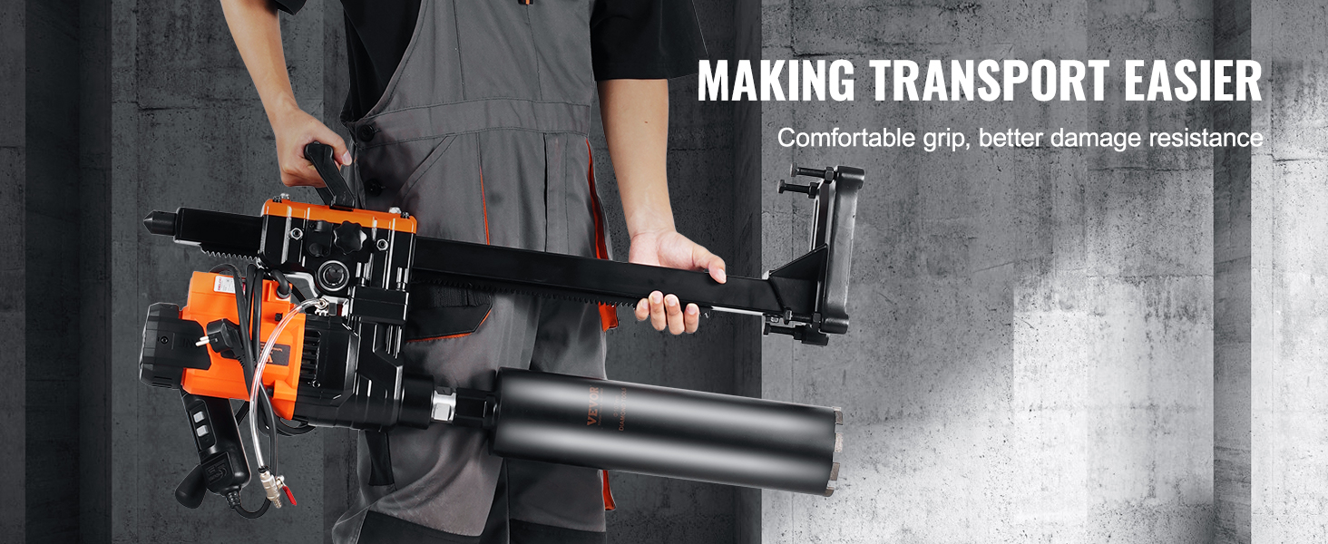 Ergonomická konštrukcia rukoväte uľahčuje používanie na staveniskách a zároveň zabezpečuje bezpečnosť a stabilitu jadrovej vŕtačky počas prepravy a skladovania. Účinne zabraňuje poškodeniu v dôsledku nárazov počas prepravy.