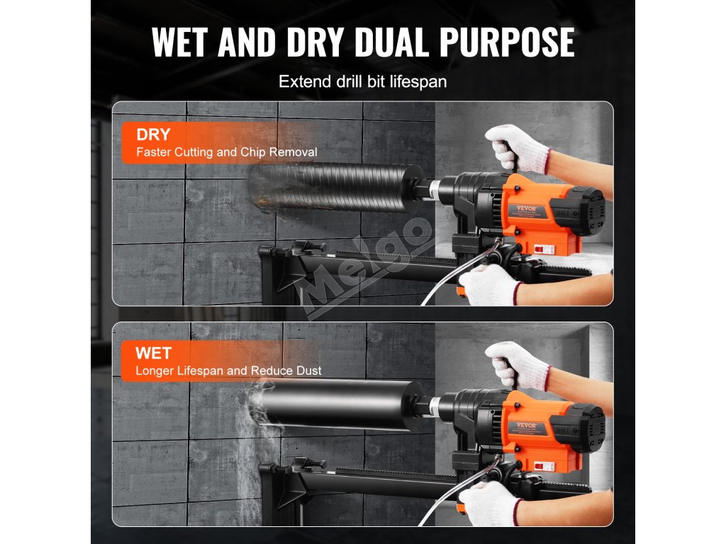 Vyskúšajte vynikajúcu rýchlosť rezania a odstraňovania úlomkov vďaka režimu suchého rezania. Režim mokrého rezania znižuje prašnosť a prehrievanie počas prevádzky, čím zvyšuje bezpečnosť a komfort v pracovnom prostredí. Pomáha tiež znižovať opotrebovanie nástrojov, čím predlžuje životnosť jadrového vŕtacieho stroja.