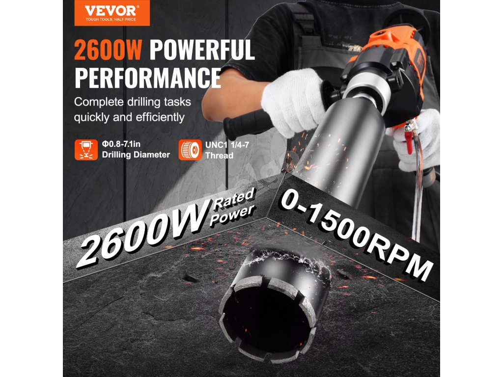 Motor jadrovej vŕtačky s výkonom 2600 W poskytuje dostatočný výkon na prácu s náročnými materiálmi, vďaka čomu je proces vŕtania rýchlejší a stabilnejší. Nastaviteľné otáčky umožňujú jemné doladenie rýchlosti podľa rôznych materiálov a požiadaviek projektu, čím sa zabezpečí presná kontrola.