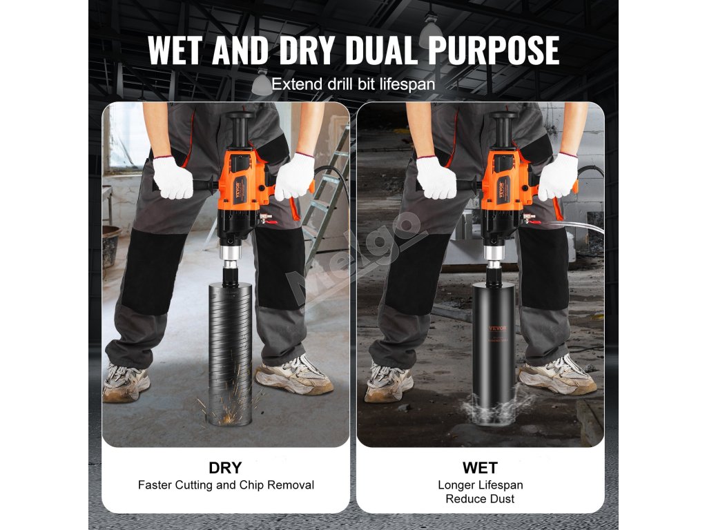 Vyskúšajte vynikajúcu rýchlosť rezania a odstraňovania úlomkov vďaka režimu suchého rezania. Režim mokrého rezania znižuje prašnosť a prehrievanie počas práce, čím zvyšuje bezpečnosť a komfort v pracovnom prostredí. Pomáha tiež znižovať opotrebovanie nástrojov, čím predlžuje životnosť jadrového vŕtacieho stroja.