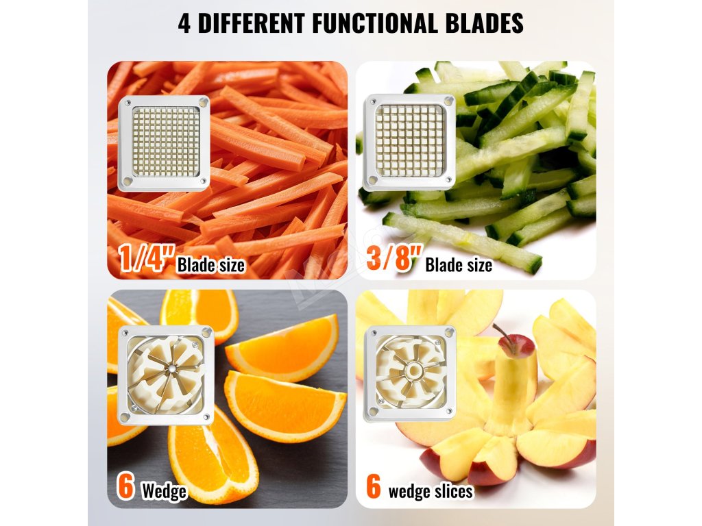 Toto zariadenie obsahuje štyri vymeniteľné nože vrátane dvoch nožov na krájanie hranolčekov na krájanie zeleniny na rovnomerné pásiky vo veľkosti 1/4 palca a 3/8 palca a dvoch 6-hranných krájačov (jeden s jadrovníkom).