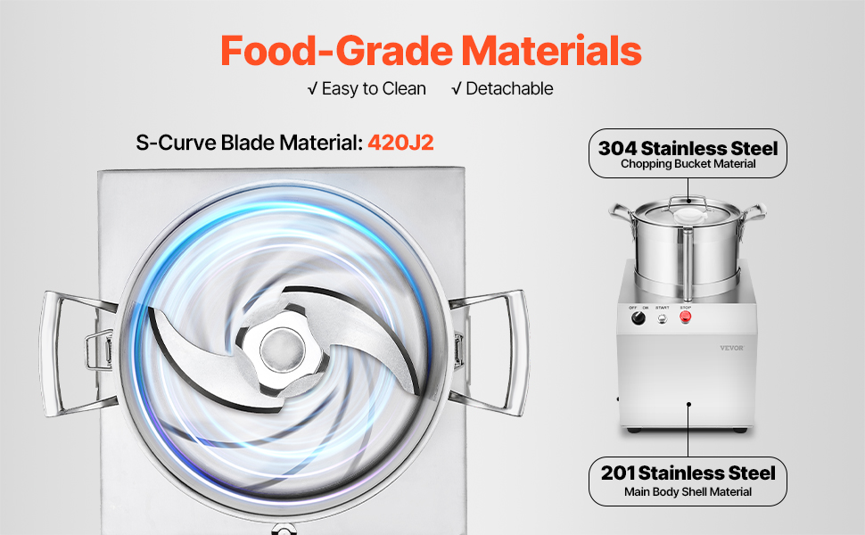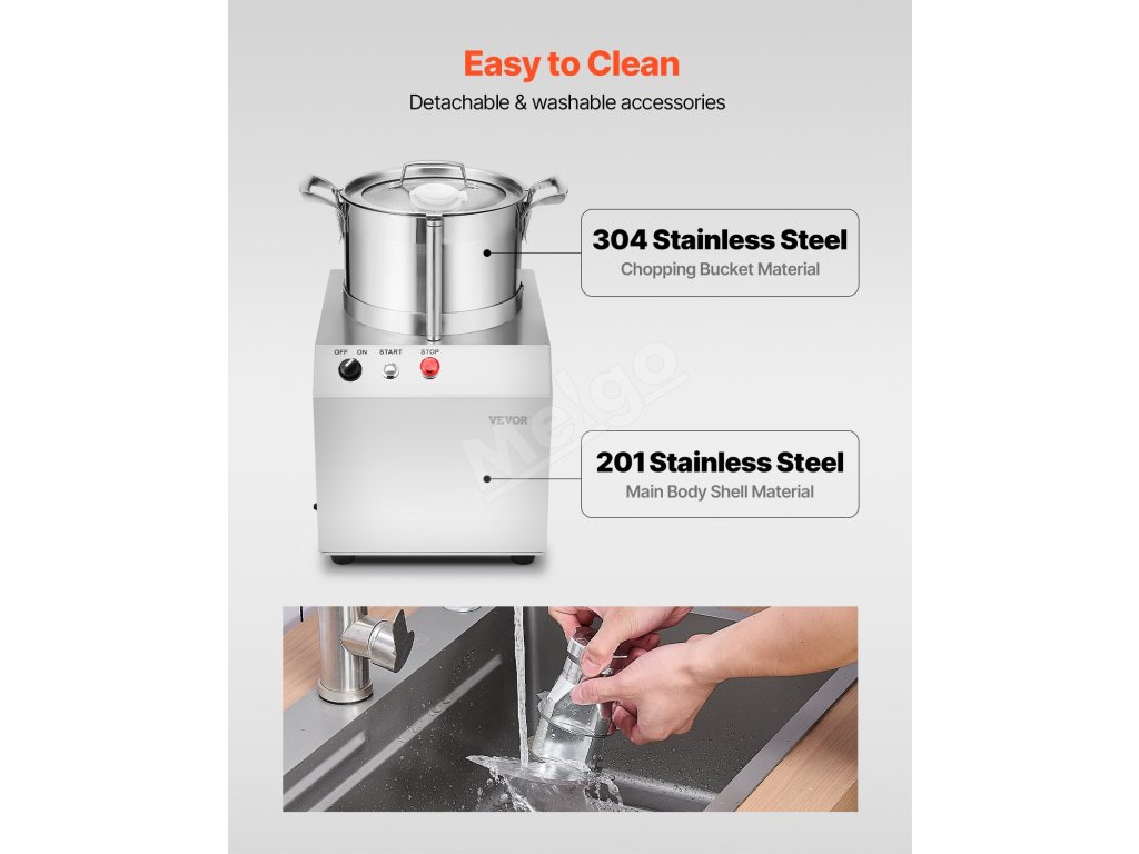 Náš kuchynský robot má celonerezové telo s ľahko odnímateľnými a umývateľnými komponentmi na údržbu bez námahy. Môžete sa spoľahnúť na kvalitu použitých materiálov, ktoré zabezpečia, že vaše jedlo zostane bezpečné a chutné.
