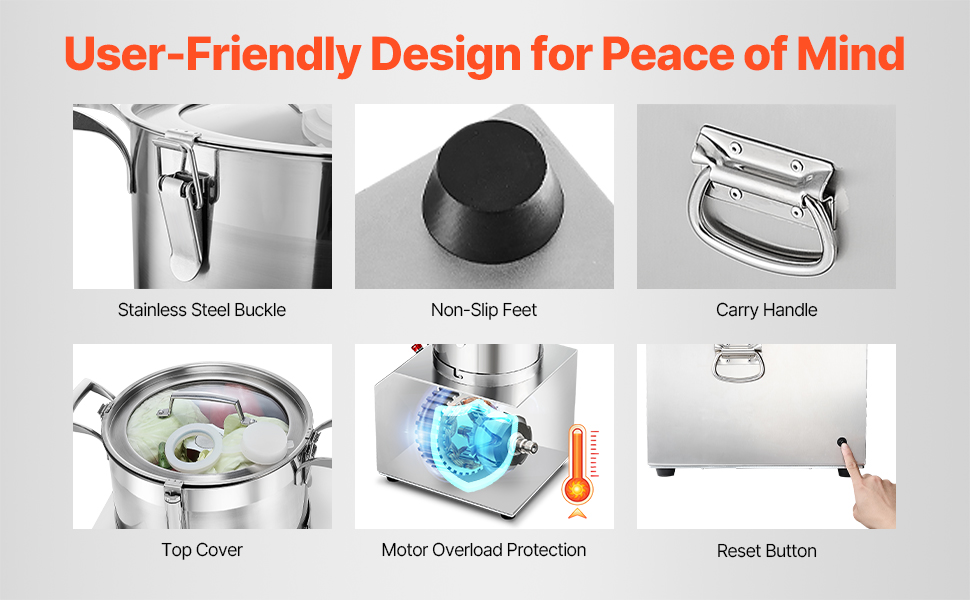 Tento kuchynský robot je vybavený štyrmi protišmykovými nožičkami, ktoré zaisťujú stabilitu a zabraňujú pošmyknutiu a zároveň poskytujú bezpečnejšiu prevádzku. Veko je navrhnuté s otvorom na pridávanie ingrediencií, čo vám umožní pridávať malé prísady bez toho, aby ste museli počas procesu zastaviť prístroj.