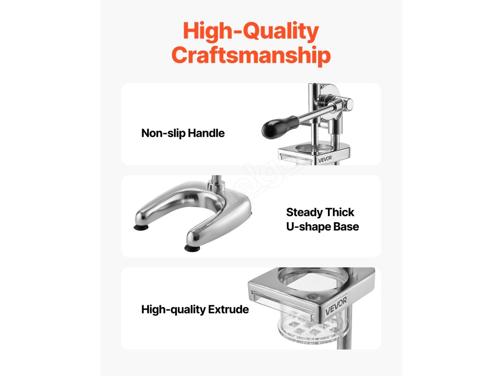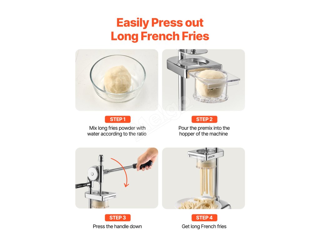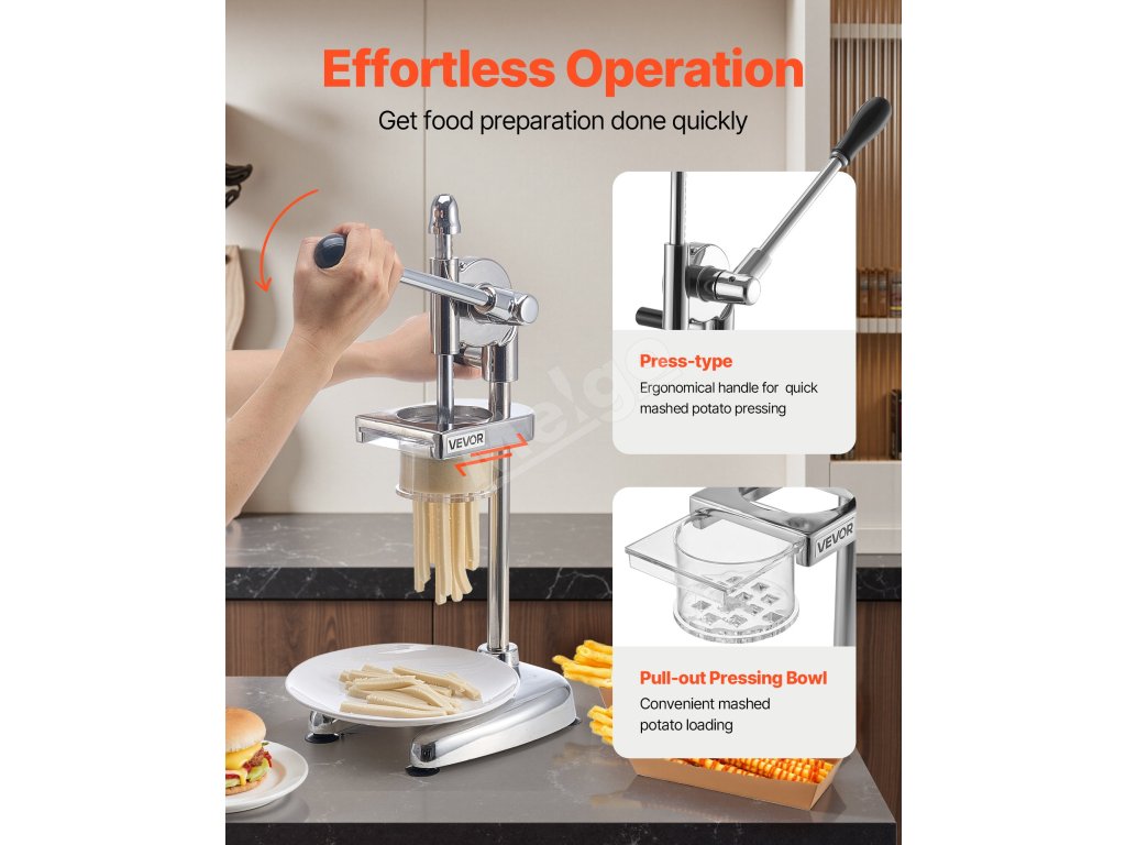 Náš ručný lis na hranolky vám umožní rýchlo získať rovnomerne dlhé hranolky jednoduchým vložením zemiakovej kaše do priloženej výsuvnej lisovacej misky, čím sa príprava občerstvenia urýchli a zjednoduší.