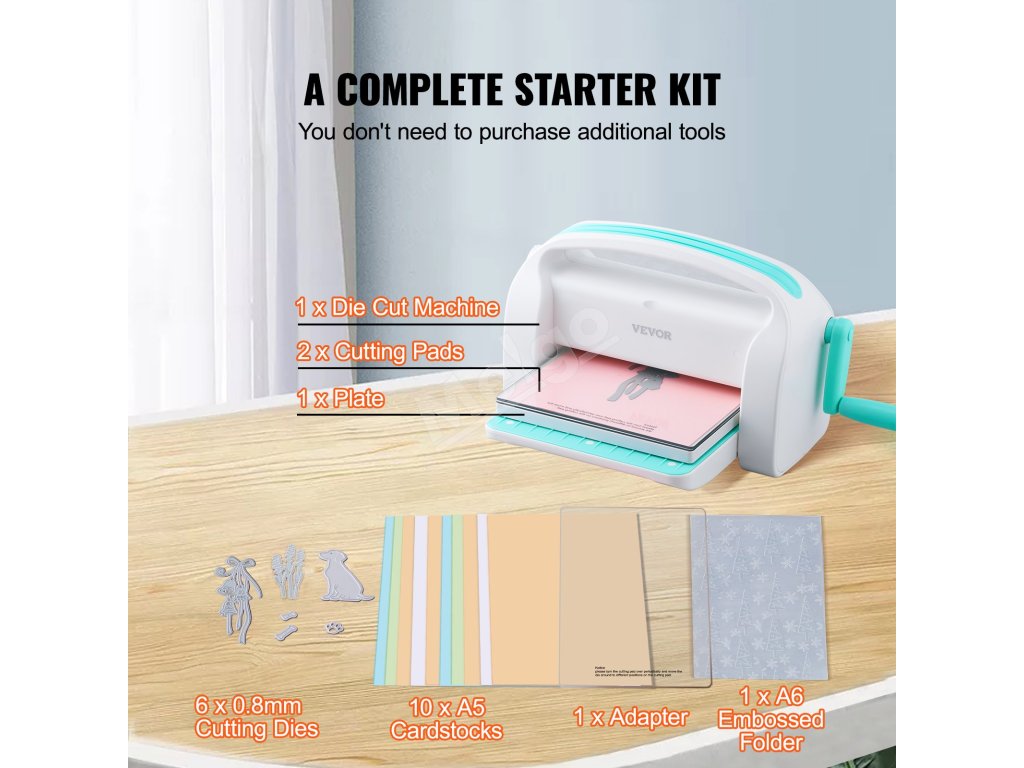 Ručný vysekávací embosovací stroj VEVOR vám poskytne všetko, čo potrebujete na začatie craftingu. Súprava obsahuje dve rezacie podložky, embosovaciu podložku a vysekávací strojček. Súčasťou je aj embosovací priečinok formátu A6, doštička, osem vyrezávacích foriem a desať kartónov A5.