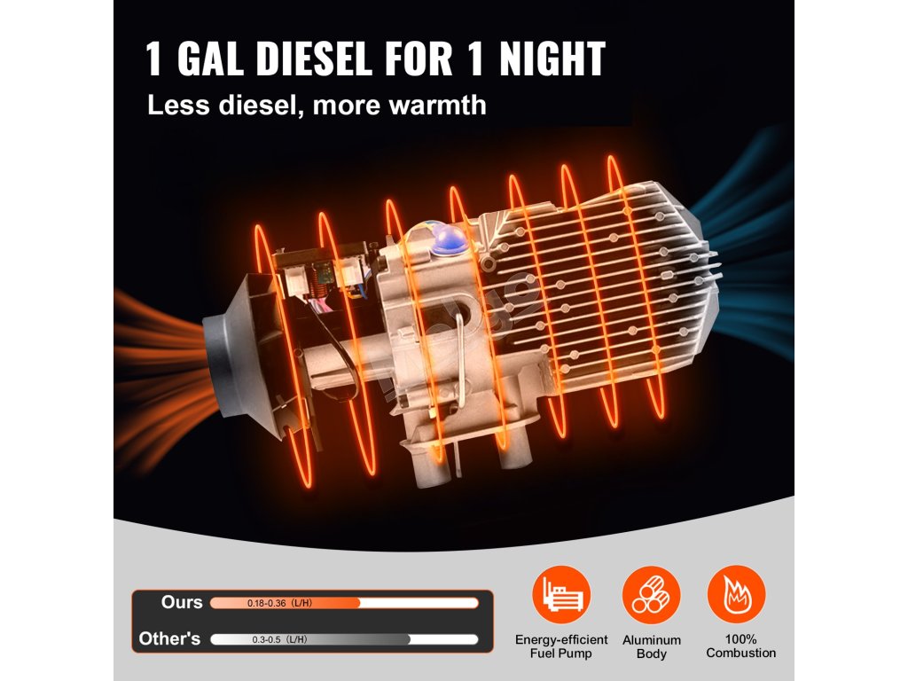 Nedovoľte, aby vás studené zimy zastavili pri cestovaní, kempovaní v štyroch ročných obdobiach a udržiavaní tepla. Dieselový ohrievač vzduchu VEVOR je pripravený rozpáliť sa nad vaše očakávania a rýchlo sa zohriať a počas prevádzky si zachováva nízku hlučnosť. Vďaka nízkej spotrebe paliva a energie je vhodný na dlhší čas prevádzky. Tento parkovací ohrievač 12V diesel môžete nainštalovať kdekoľvek vo vašom vozidle a jednoducho ho ovládať pomocou diaľkového ovládania alebo LCD panela. Jednoduchá obsluha, účinné vykurovanie, všetko vo VEVOR-e!