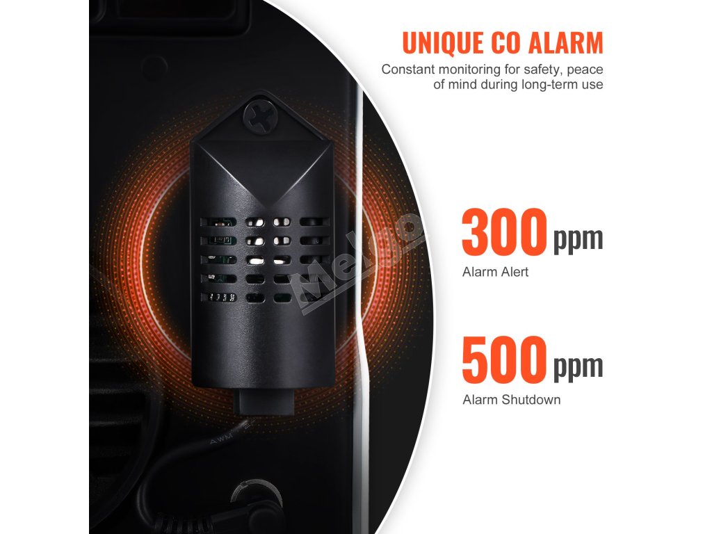 Tento naftový ohrievač vzduchu, ktorý je vybavený inovatívnym systémom alarmu CO, nepretržite monitoruje hladinu oxidu uhoľnatého. Výstrahy sa spúšťajú pri 300 ppm, s automatickým vypnutím pri 500 ppm, aby sa zabránilo otrave CO z nedokonalého spaľovania.