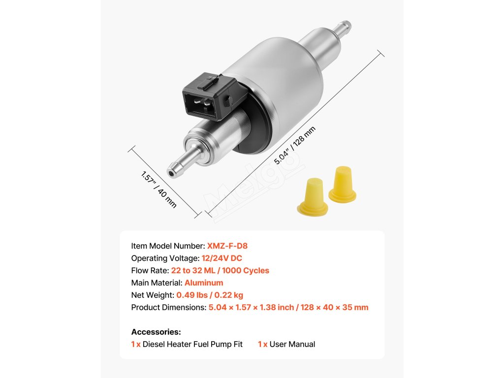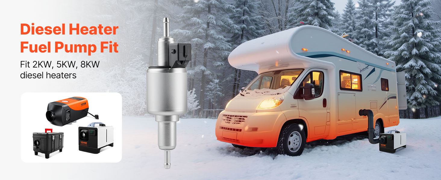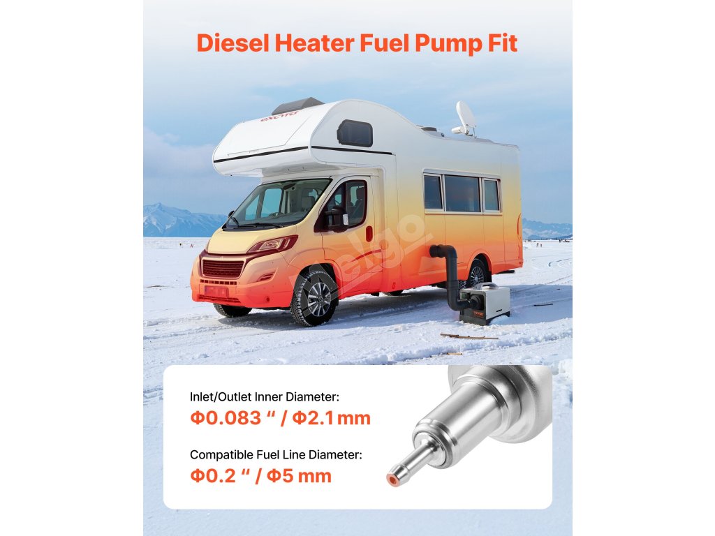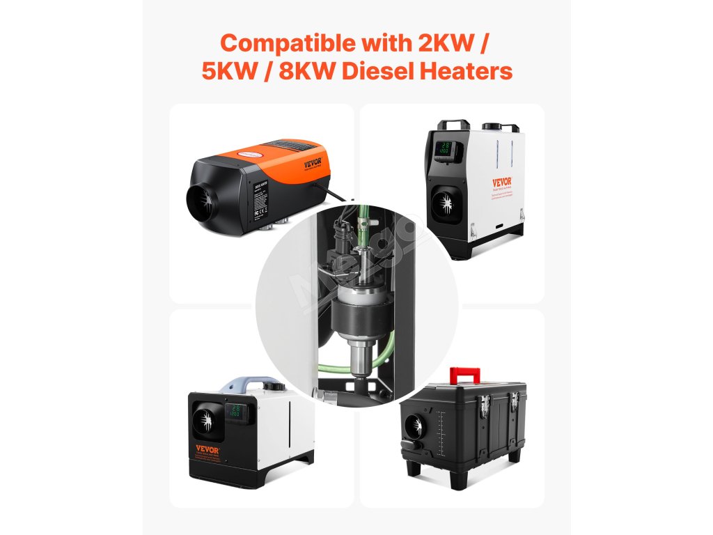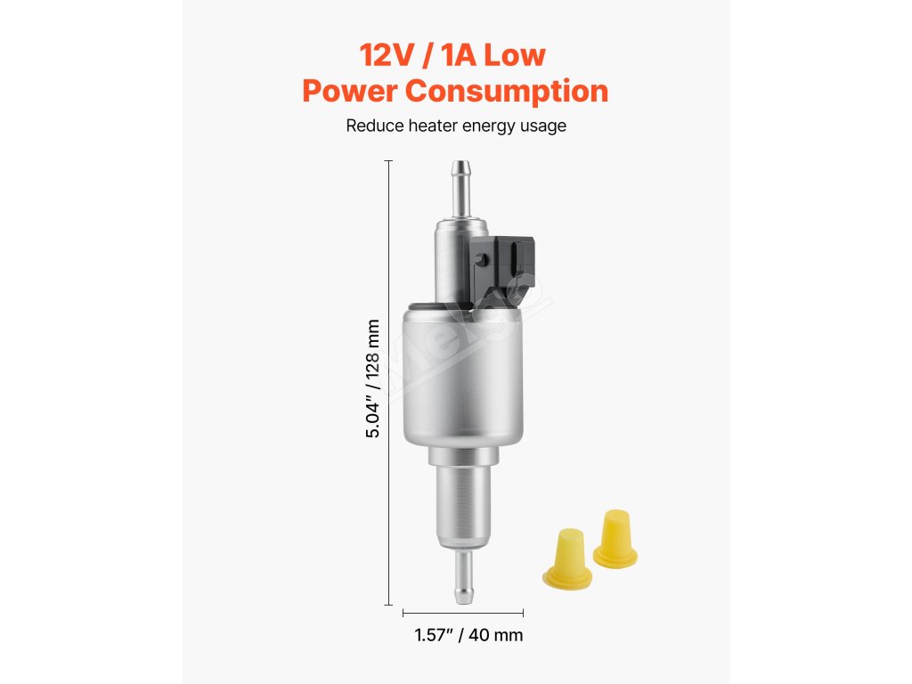 Toto palivové čerpadlo 12/24 V DC pre naftové vykurovacie zariadenie s vylepšeným nasávaním vďaka pulznému pohonu zabezpečuje stabilný prietok paliva pre vašu jednotku na ohrev vzduchu. Je vyrobené z prvotriedneho hliníka a skonštruované na jednoduché nastavenie a funguje s väčšinou modelov naftových ohrievačov s výkonom 2 kW/5 kW/8 kW.