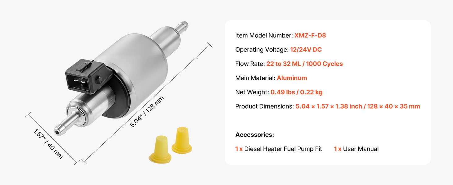 Dávkovacie palivové čerpadlo naftového ohrievača vzduchu do auta, skonštruované s presnosťou impulzného pohonu, dodáva 22 - 32 ml paliva na 1 000 cyklov, čím podporuje konzistentnú dodávku paliva. Navrhnuté na zvýšenie výkonu vykurovania pri minimalizácii nepravidelnej spotreby a preťaženia paliva.