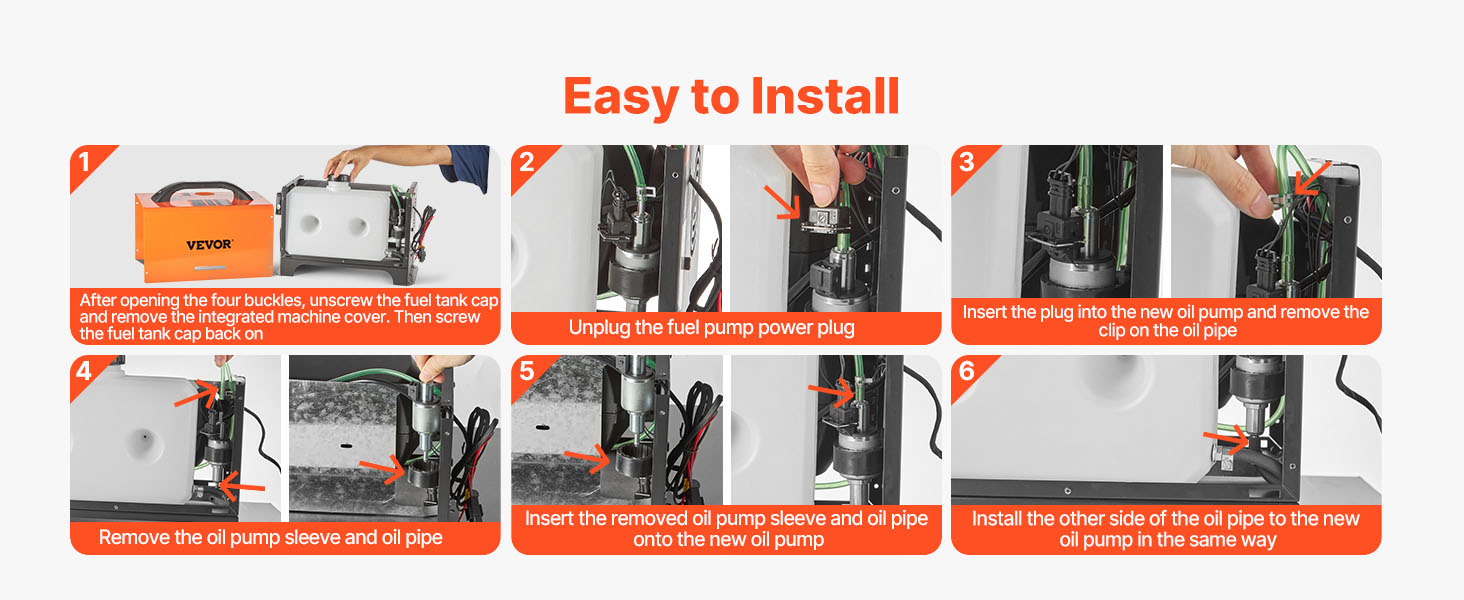 Naše naftové palivové čerpadlo pre vykurovacie zariadenia je skonštruované na jednoduché nastavenie. Pomocou iba 6 základných krokov môžete ľahko nahradiť svoju starú jednotku. Pred inštaláciou nezabudnite úplne odstrániť poškodené čerpadlo a uistite sa, že všetky svorky a hadičky sú správne pripojené.