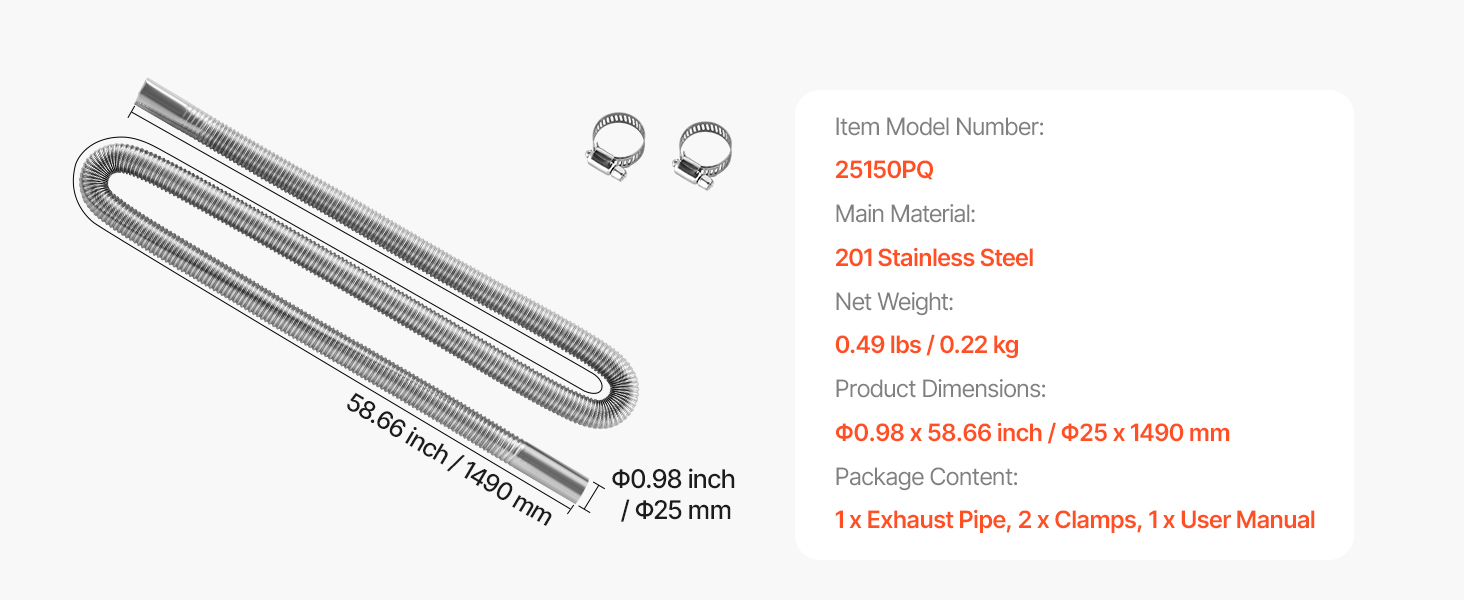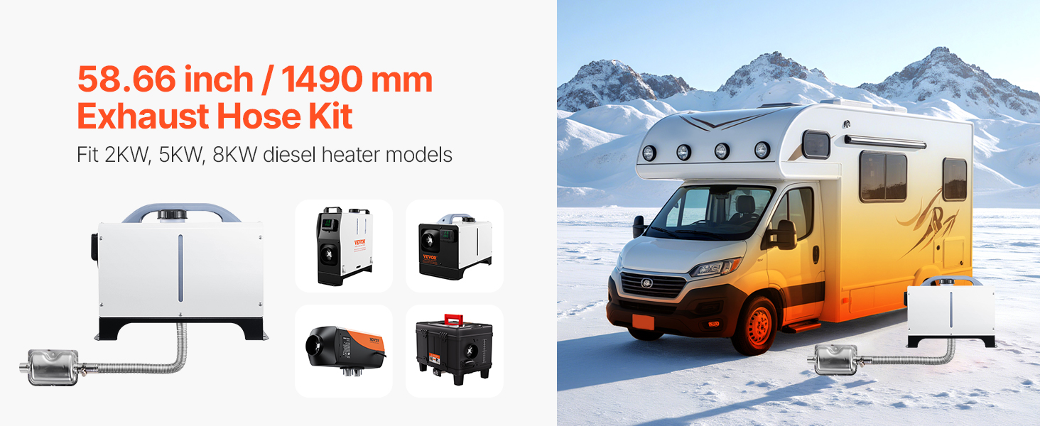 Táto výfuková hadica s priemerom 58,7 palca / 1490 mm je vyrobená z nehrdzavejúcej ocele pre trvalú odolnosť. Ponúka silnú odolnosť proti korózii a odolnosť voči poveternostným vplyvom, je vhodná pre väčšinu 2KW, 5KW a 8KW dieselových ohrievačov a je navrhnutá na rýchlu inštaláciu a spoľahlivé používanie.