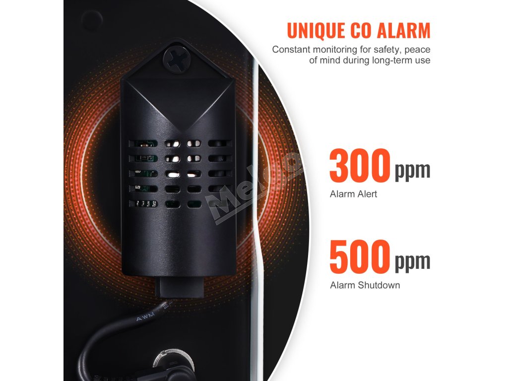 Tento naftový ohrievač vzduchu, ktorý je vybavený inovatívnym systémom alarmu CO, nepretržite monitoruje hladinu oxidu uhoľnatého. Výstrahy sa spúšťajú pri 300 ppm, s automatickým vypnutím pri 500 ppm, aby sa zabránilo otrave CO z nedokonalého spaľovania.