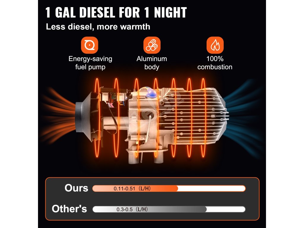 Nedovoľte, aby vás studené zimy zastavili pri cestovaní, kempovaní v štyroch ročných obdobiach a udržiavaní tepla. Dieselový ohrievač vzduchu VEVOR je pripravený rozpáliť sa nad vaše očakávania a rýchlo sa zohriať a počas prevádzky si zachováva nízku hlučnosť. Vďaka nízkej spotrebe paliva a energie je vhodný na dlhší čas prevádzky. Tento parkovací ohrievač 12V diesel môžete nainštalovať kdekoľvek vo vašom vozidle a jednoducho ho ovládať pomocou diaľkového ovládania alebo LCD panela. Jednoduchá obsluha, účinné vykurovanie, všetko vo VEVOR-e!