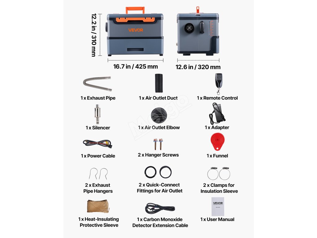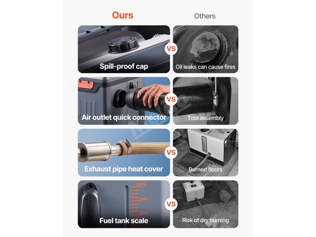 Tento prenosný naftový ohrievač s výkonom 8 kW sa pripája k napájaniu vozidla a obsahuje adaptér pre napájacie stanice alebo napájanie z domácnosti striedavým prúdom. Poskytuje rýchle a účinné vykurovanie pre stany, rybárčenie na ľade, obytné vozidlá, nákladné vozidlá, SUV, dodávky a ďalšie. Je navrhnutý tak, aby zvládol chladné prostredie a rýchlo vyhrieva veľké priestory.