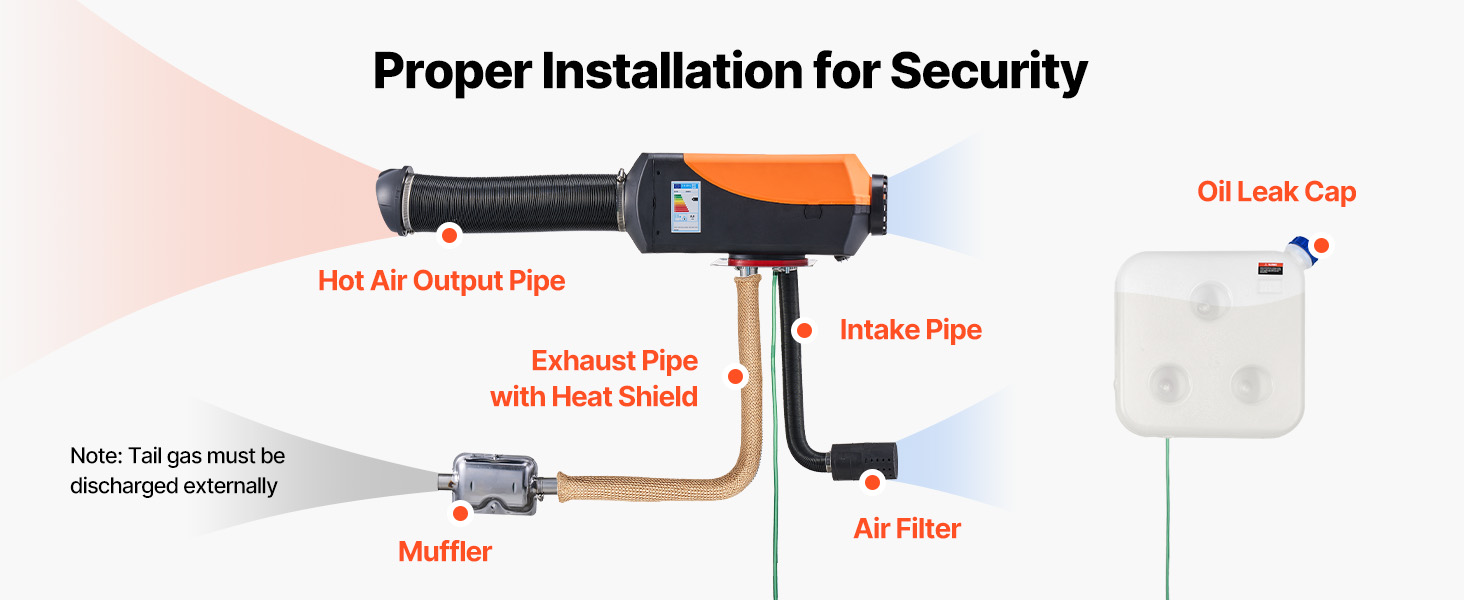 Dôležité upozornenie: 1. Výfukové potrubie musí smerovať von, aby sa zabránilo prenikaniu oxidu uhoľnatého do kabíny. 2. Dbajte na to, aby boli nasávacia rúrka a tlmič výfuku vysunuté vodorovne bez nadmerného ohýbania a aby boli oddelené od výfukovej rúrky, aby sa zabránilo znečisteniu vzduchu.