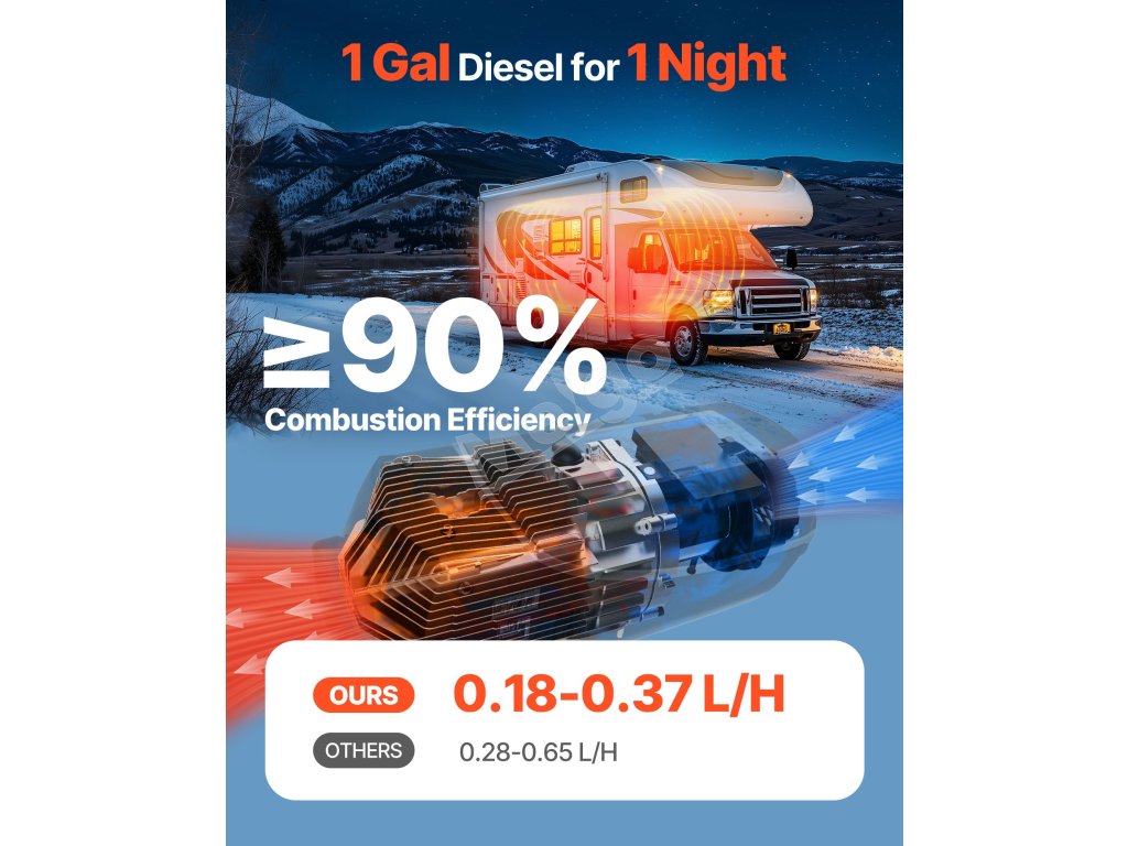 Nemusíte sa obávať nadmernej spotreby paliva počas dlhých výletov v teréne s obytným vozidlom. Náš naftový ohrievač vzduchu sa môže pochváliť pôsobivou palivovou účinnosťou ≥ 90 %, čo zaručuje, že každá kvapka nafty je plne využitá. Na celonočné vykurovanie je potrebný iba 1 galón nafty.