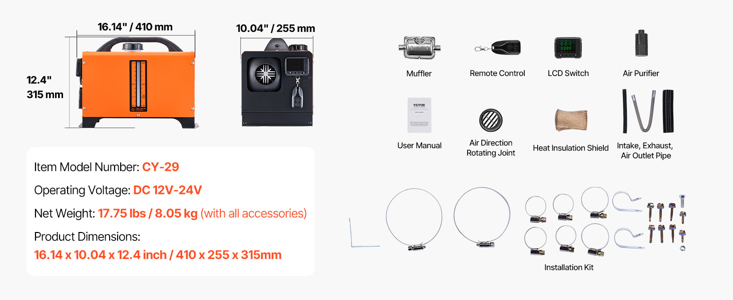 Toto naftové vykurovacie zariadenie je navrhnuté na napájanie 12-24 V a je vhodné pre širokú škálu vozidiel vrátane osobných a nákladných automobilov, lodí, bagrov a ďalších. Rozlúčte sa s mrazivými zimnými ránami a zostaňte v teple bez ohľadu na to, kde sa nachádzate.