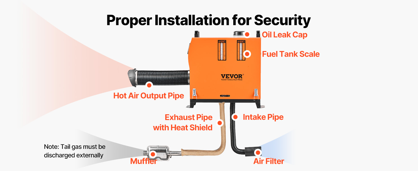 Dôležité upozornenie: 1. Výfukové potrubie musí smerovať von, aby sa zabránilo prenikaniu oxidu uhoľnatého do kabíny. 2. Dbajte na to, aby boli nasávacia rúrka a tlmič výfuku vysunuté vodorovne bez nadmerného ohýbania a aby boli oddelené od výfukovej rúrky, aby sa zabránilo znečisteniu vzduchu.