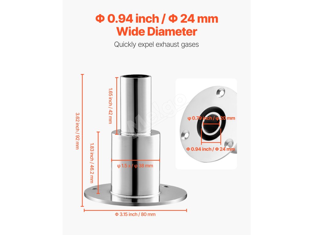 Vďaka svojmu vývodu so šírkou Φ 0,94 palca / Φ 24 mm zabezpečuje táto tvarovka výfukového plášťa naftového ohrievača rýchle odstránenie výfukových plynov. Znižuje riziko vnútornej akumulácie, čím pomáha udržiavať stabilný vykurovací výkon a spoľahlivú prevádzku v rôznych prostrediach.