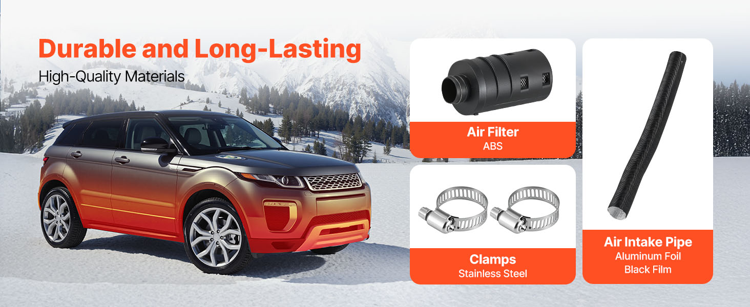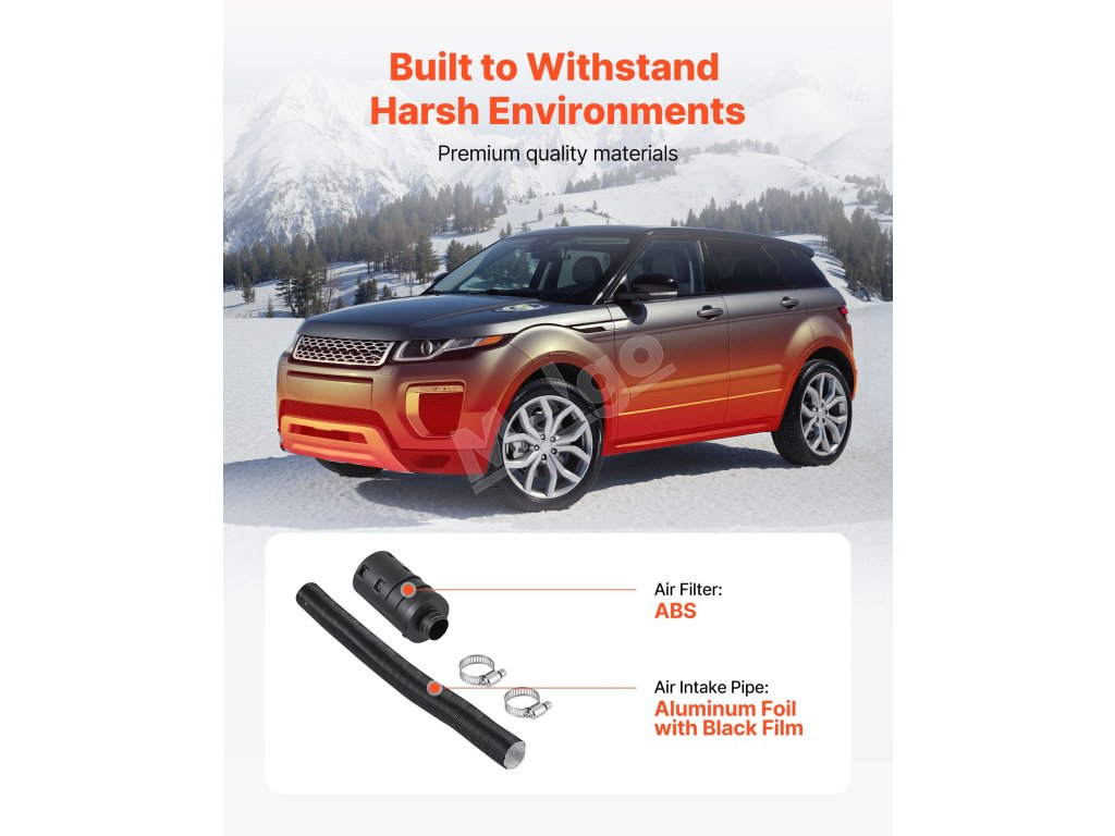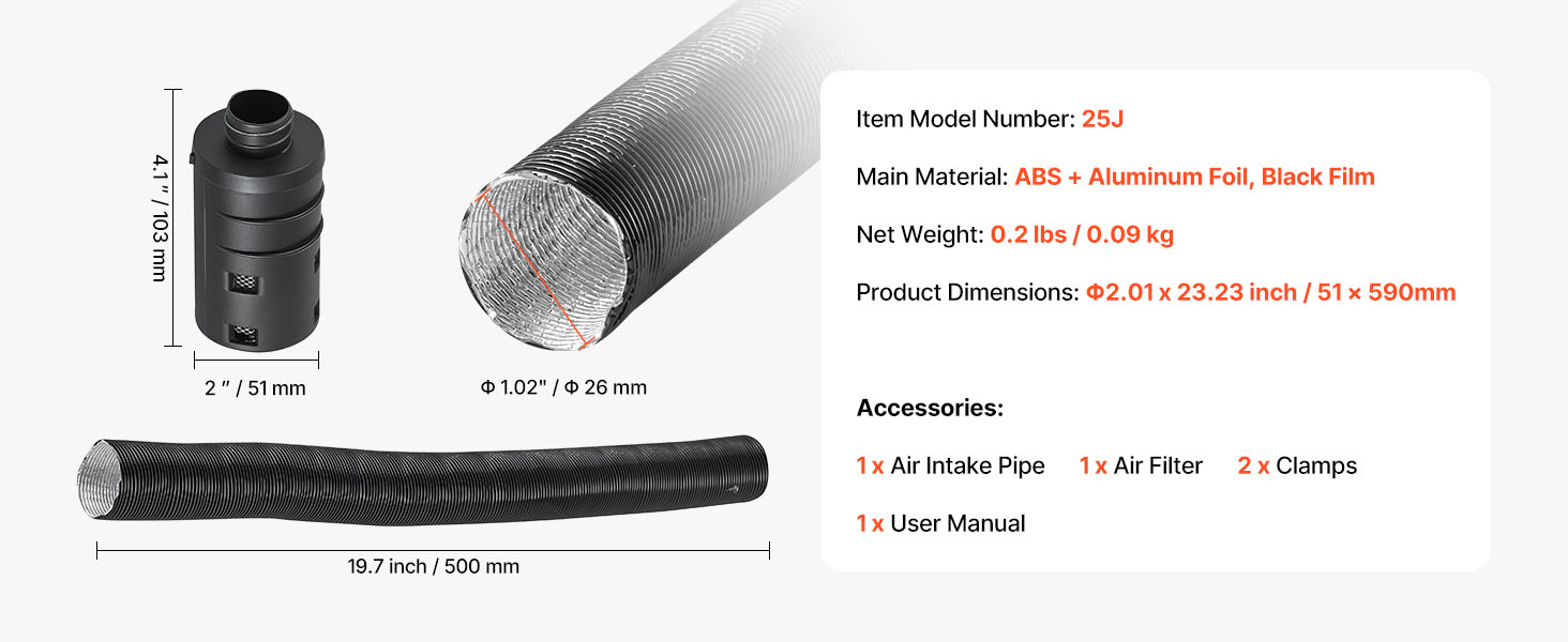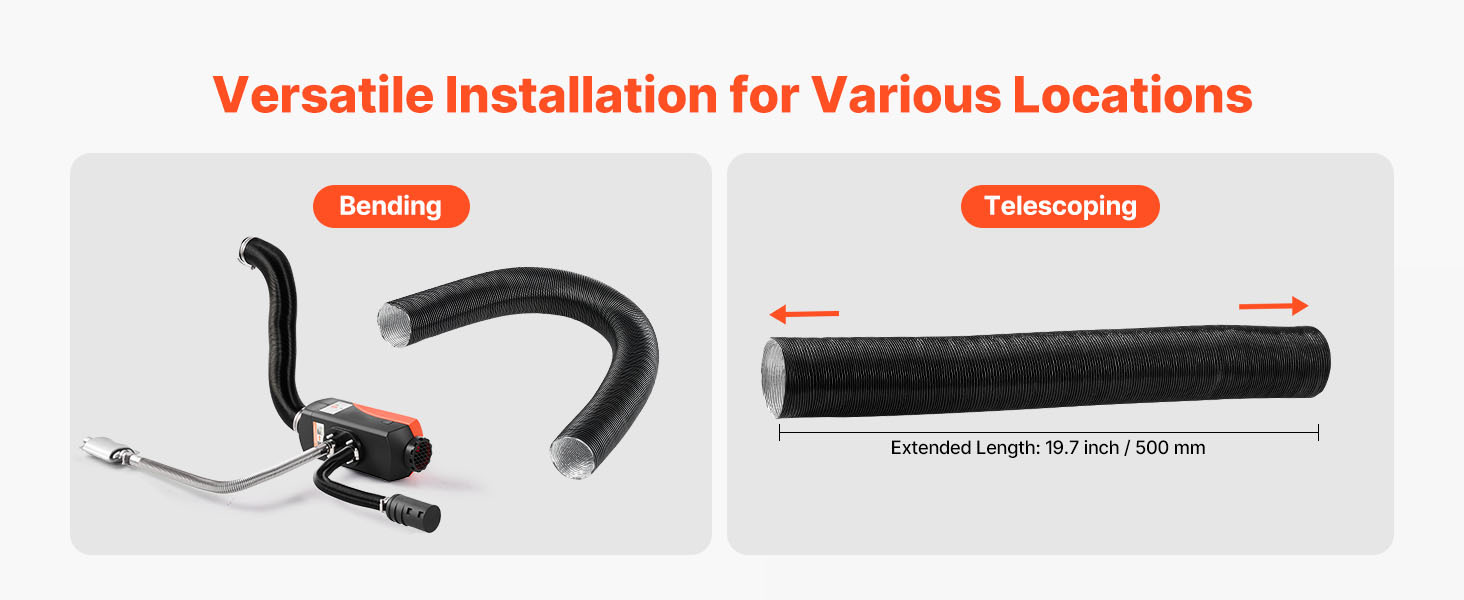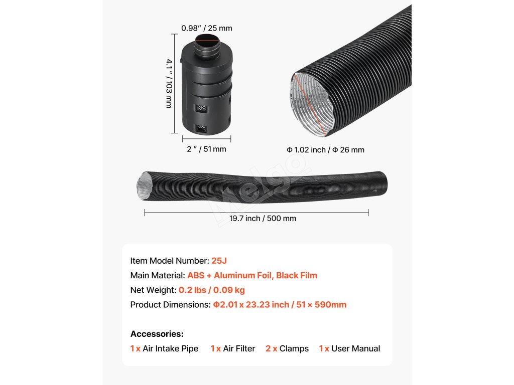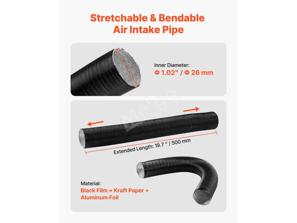 Vyrobené na jednoduché vedenie, potrubie sacieho potrubia vykurovacieho zariadenia s tlmičom vzduchu s filtrom sa môže ohýbať a predlžovať až na 19,7 palca / 500 mm, čo umožňuje rýchle nastavenie dĺžky pre rôzne usporiadania. Pomáha vám dosiahnuť plynulé nasávanie a jednoduchú inštaláciu.