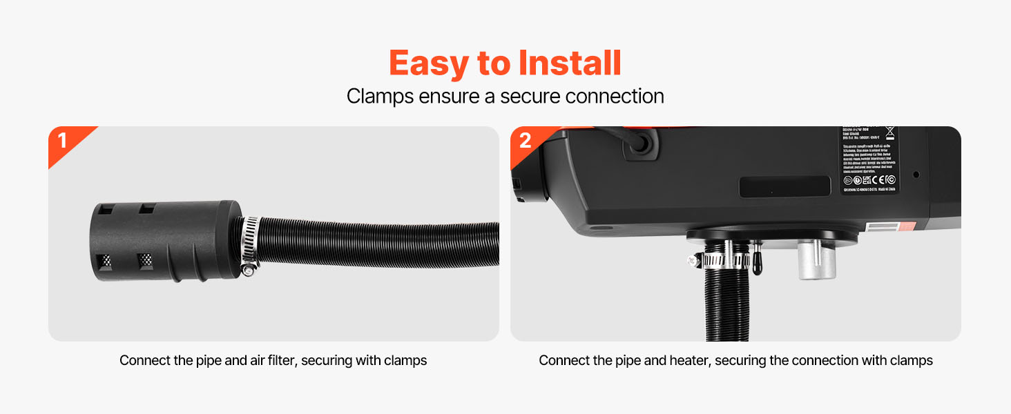 Naša súprava nasávacích hadíc naftového kúrenia zjednodušuje proces inštalácie, pretože si vyžaduje len 2 kroky. Uistite sa, že ste úplne odstránili staré, poškodené diely, a potom skontrolujte všetky svorky, či sú pevne spojené, aby ste zabezpečili účinné nasávanie vzduchu a bezproblémovú prevádzku ohrievača.