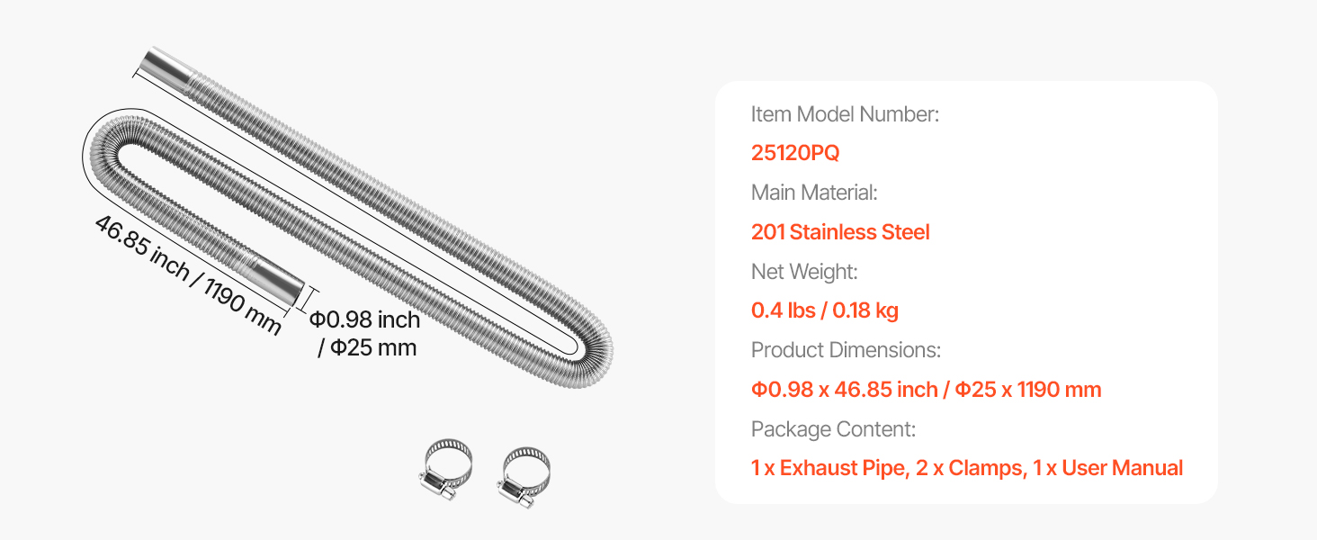 Výfukové potrubie naftového ohrievača VEVOR je navrhnuté na jednoduchú inštaláciu v iba 2 krokoch. Pred výmenou úplne odstráňte staré poškodené potrubie a uistite sa, že všetky svorky sú pevne zaistené pre stabilný tok výfukových plynov a spoľahlivú prevádzku ohrievača.