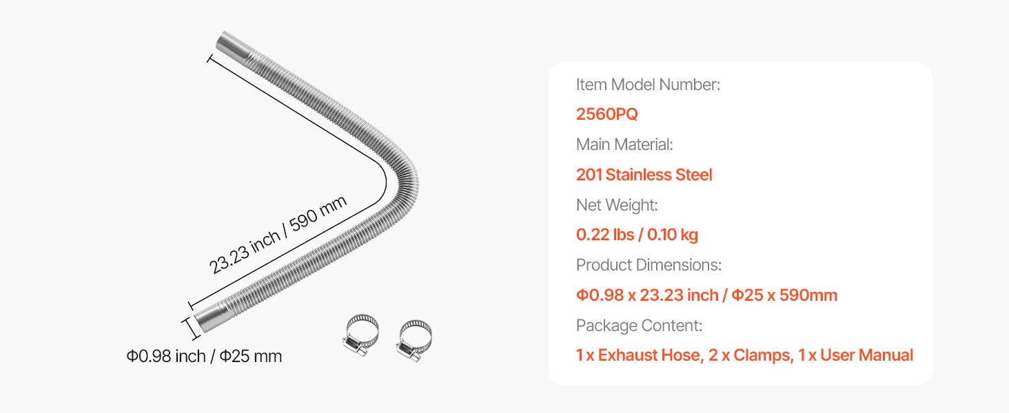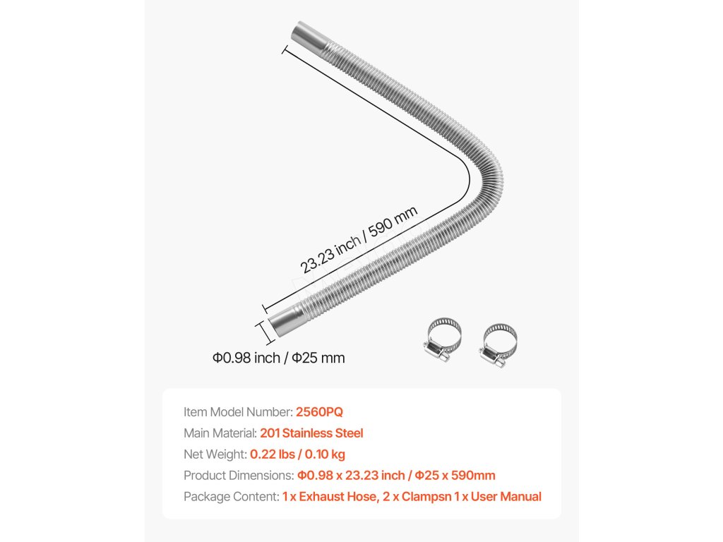 Táto výfuková hadica s priemerom 23,6 palca / 600 mm je vyrobená z nehrdzavejúcej ocele pre trvalú odolnosť. Ponúka silnú odolnosť proti korózii a odolnosť voči poveternostným vplyvom, je vhodná pre väčšinu 2KW, 5KW a 8KW dieselových ohrievačov a je navrhnutá na rýchlu inštaláciu a spoľahlivé používanie.