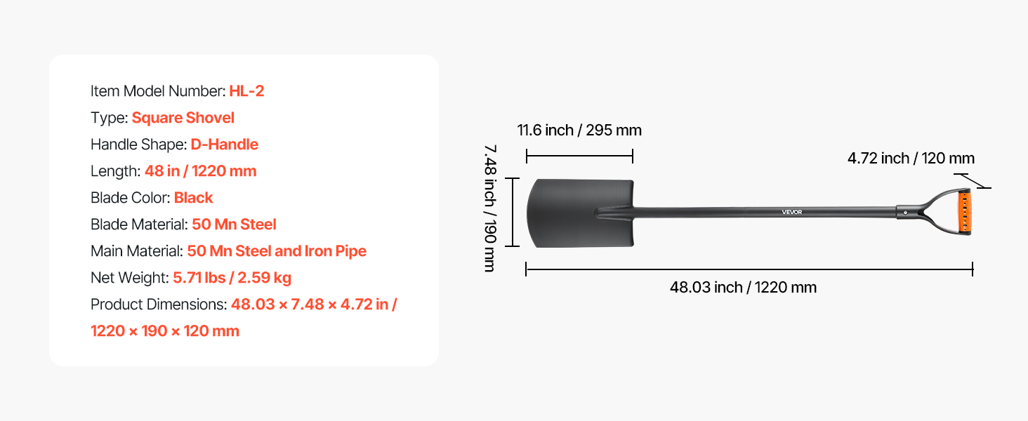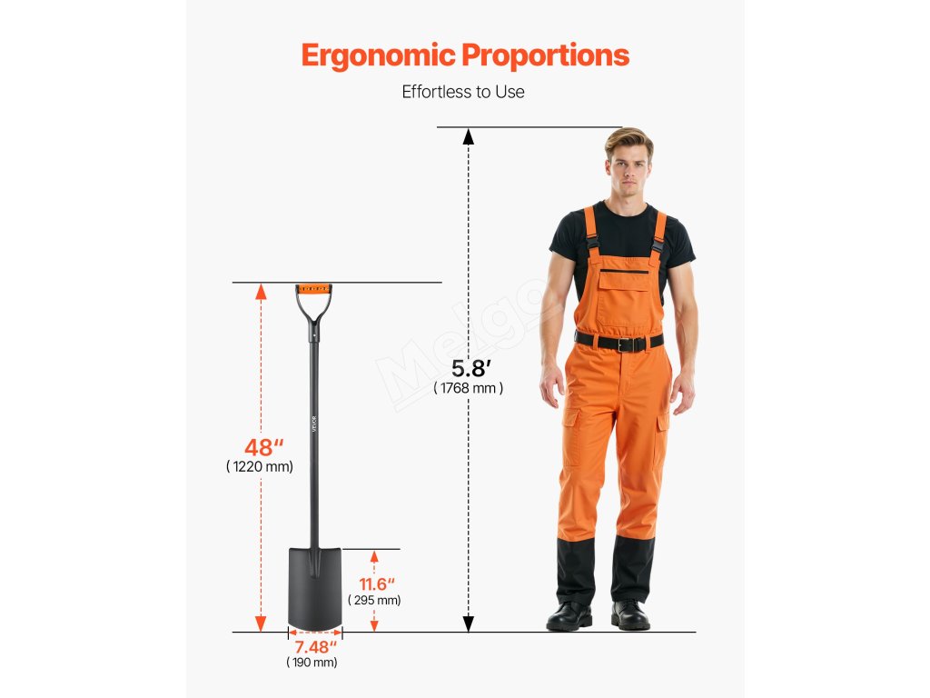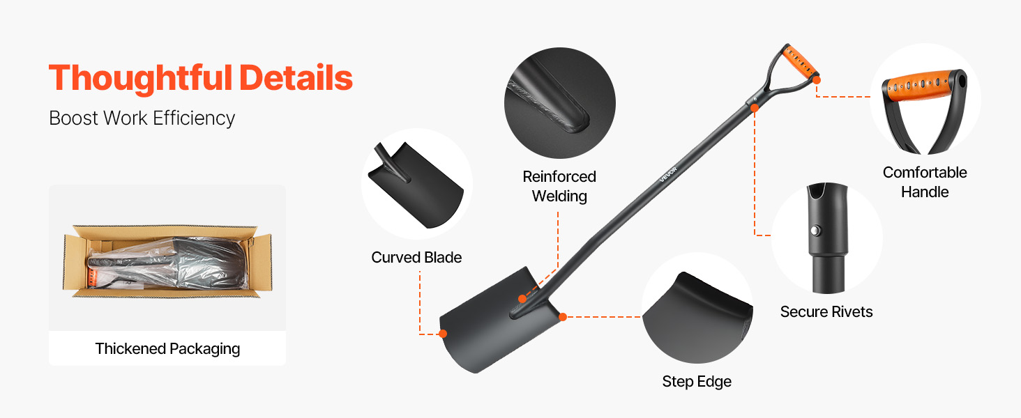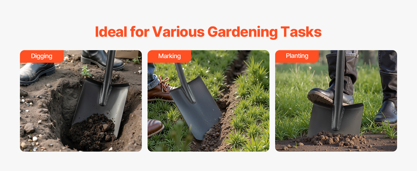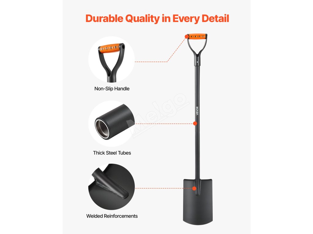 Kovová štvorcová lopata je navrhnutá s užívateľsky prívetivými funkciami vo viacerých oblastiach, aby poskytovala lepší pracovný zážitok. Zostáva pevná a odolná aj po dlhodobom používaní.